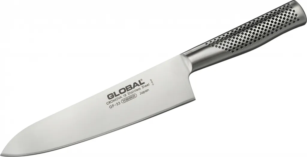 Поварской нож GF-33 Global имеет кованую конструкцию. Благодаря лезвию длиной 21 см он подходит для всех основных целей на кухне. Многим поварам, особенно в Европе, работать тяжелым ножом приятнее, чем легким кухонным. По этой причине Global Yoshikin предлагает широкий выбор более тяжелой серии GF. F означает кованую версию. Использование большего количества стали в производственном процессе делает эту серию толще, и поэтому ножи значительно тяжелее.