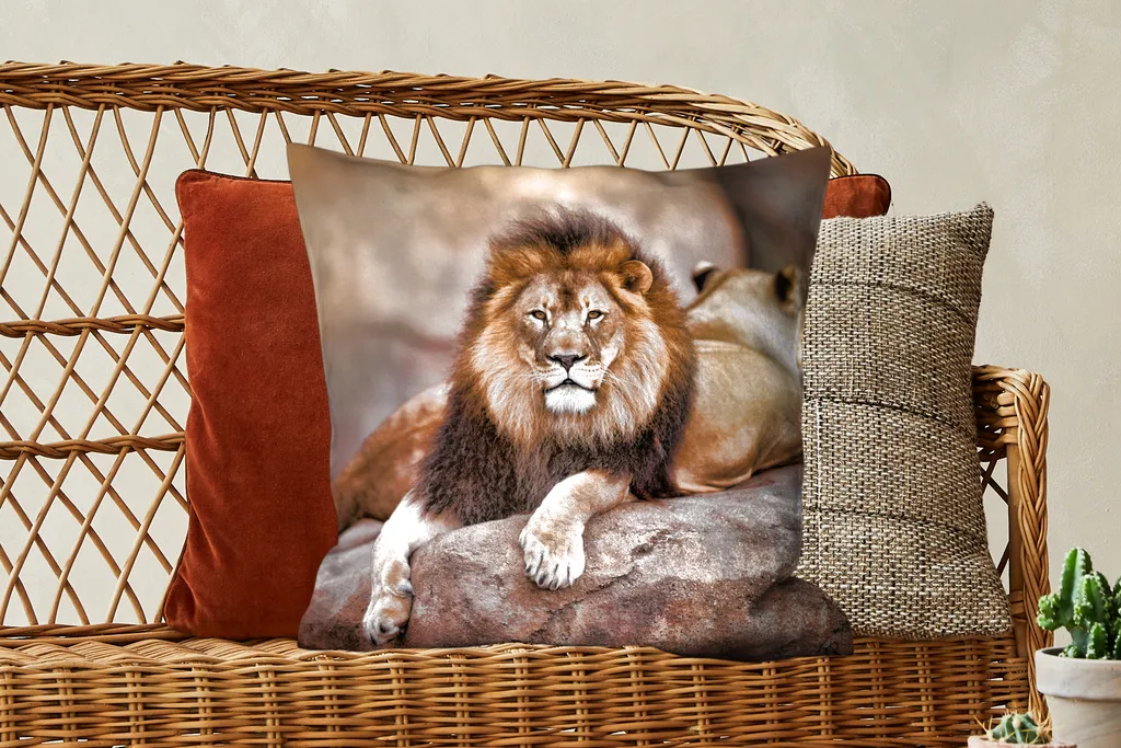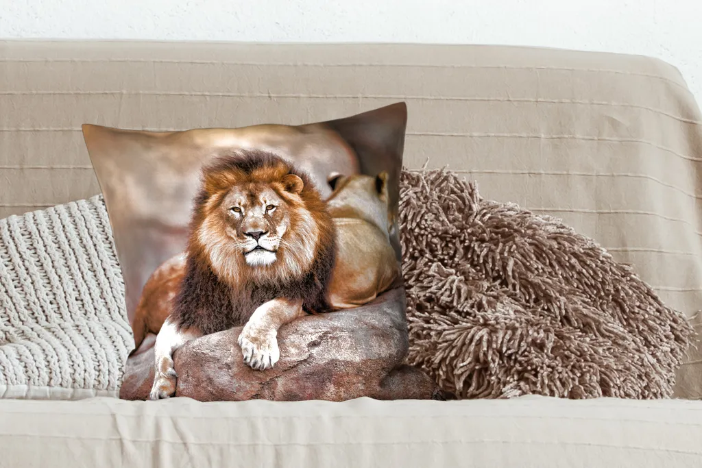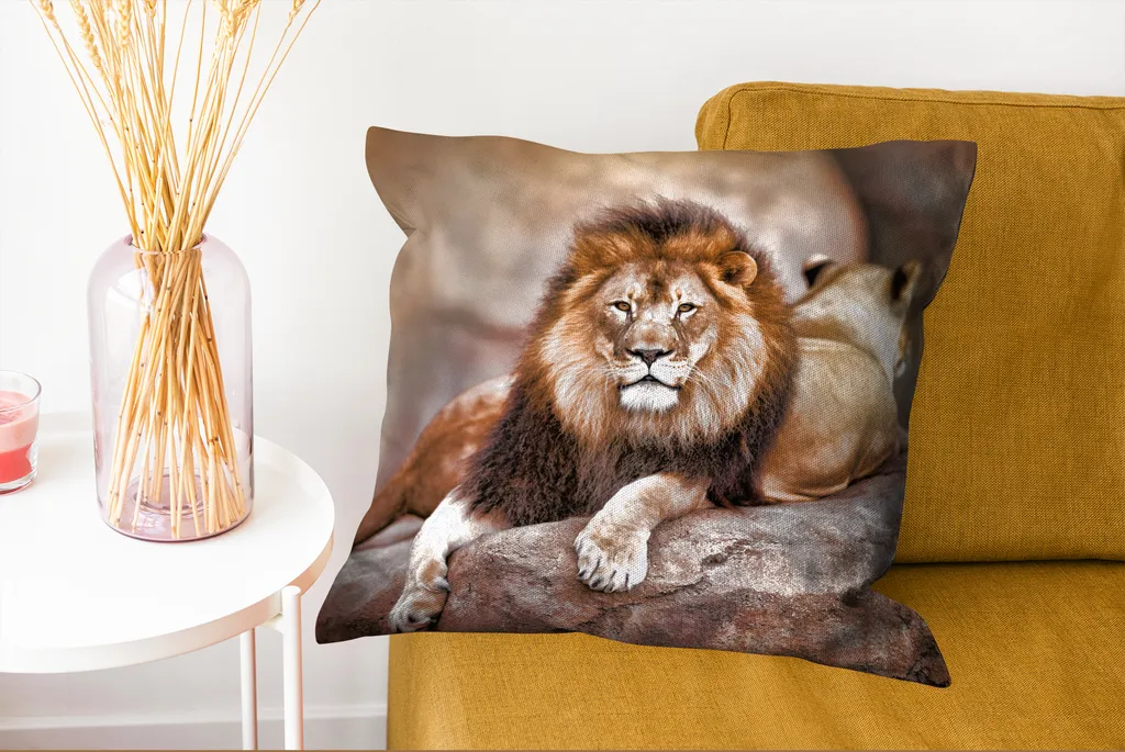 Лев и львица лежат вместе на камне. У льва темная грива, и он смотрит прямо в камеру. Дополните интерьер своей гостиной или спальни этой классной картиной.Доставка товаров осуществляется курьером или на пункт выдачи заказов.