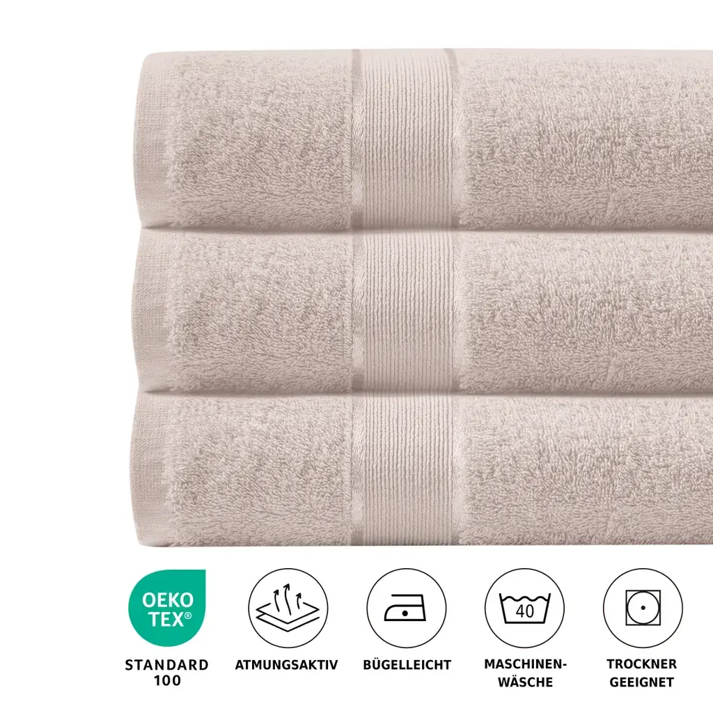 Все размеры оснащены очень практичными вешалками для шнура. Размеры: рукавица для мытья 15х21 см, мочалка или Полотенце для гостей 30x50 см, полотенце для рук 50x100 см, полотенце для душа 70x140 см, банное полотенце 100x150 см и полотенце для сауны 80x200 см. Простой и неподвластный времени дизайн с элегантной каймой