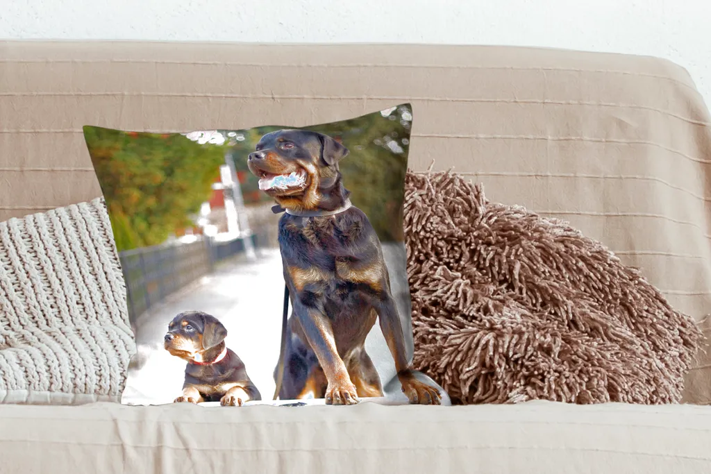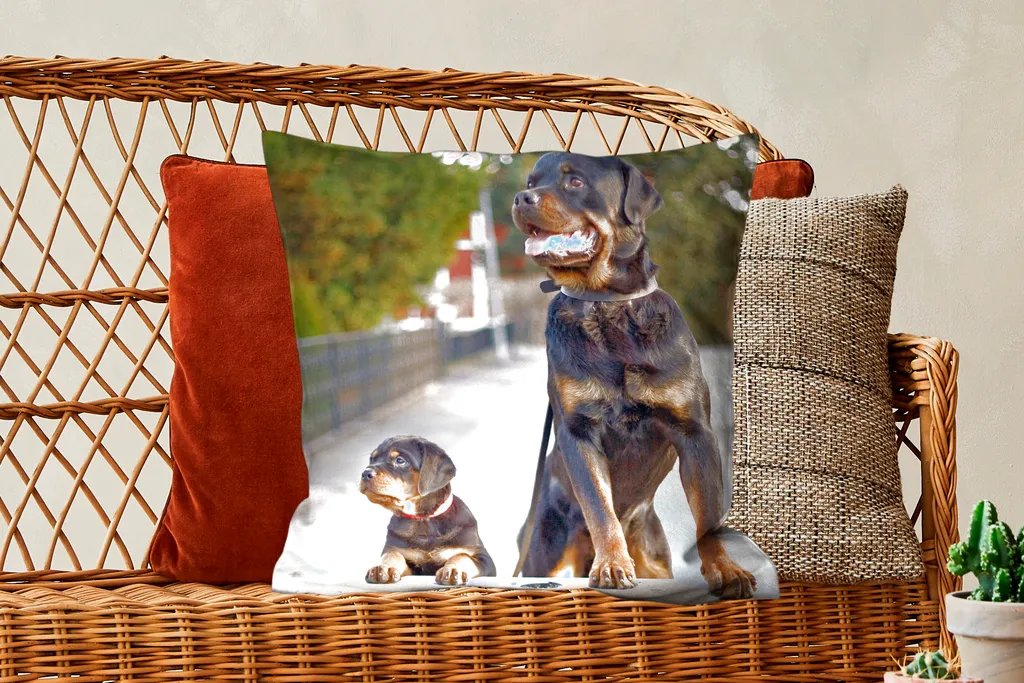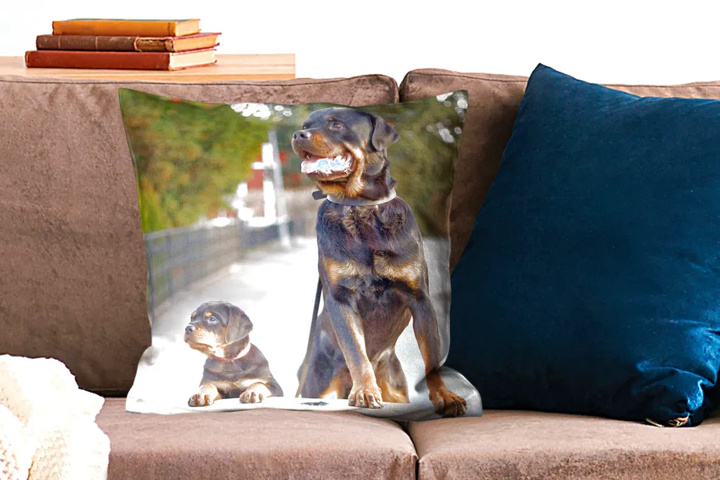 Щенок ротвейлера рядом со взрослым ротвейлером. У породы есть красновато-коричневые отметины вокруг щек, морды, бровей, груди и ног.Доставка товаров осуществляется курьером или на пункт выдачи заказов.