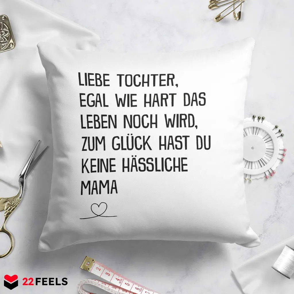 На чехле подушки надпись: Дорогая дочка, какой бы трудной ни была жизнь, к счастью, у тебя нет некрасивой мамы.