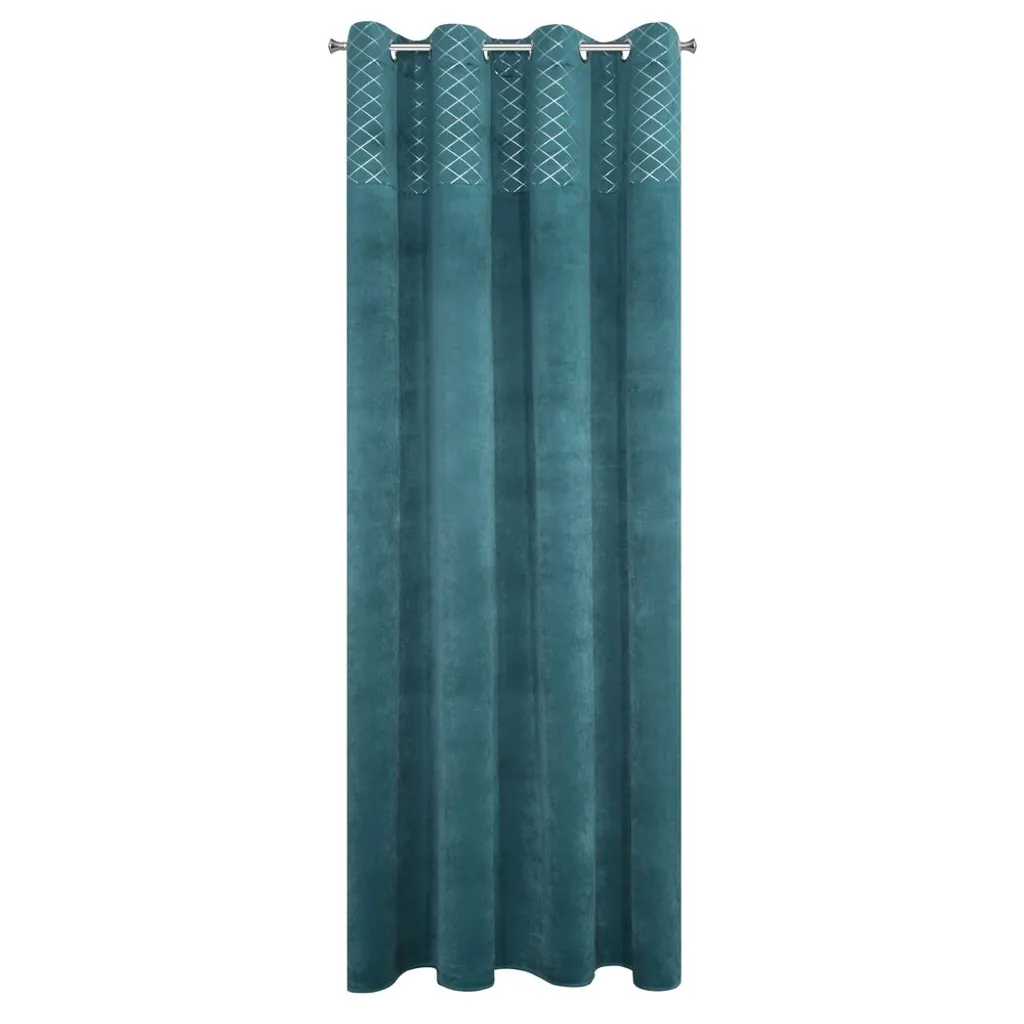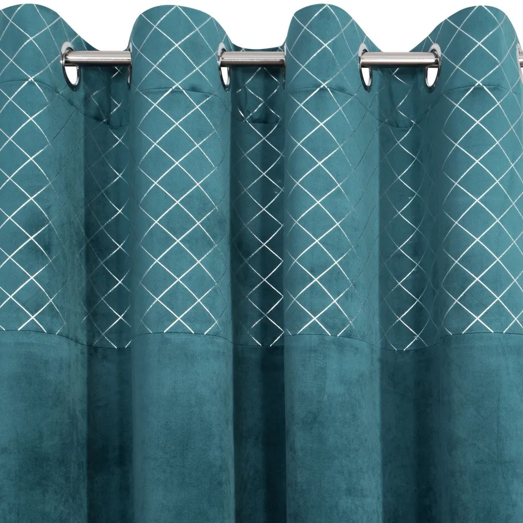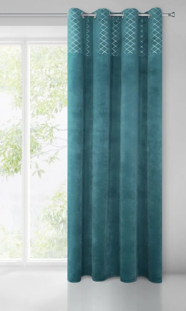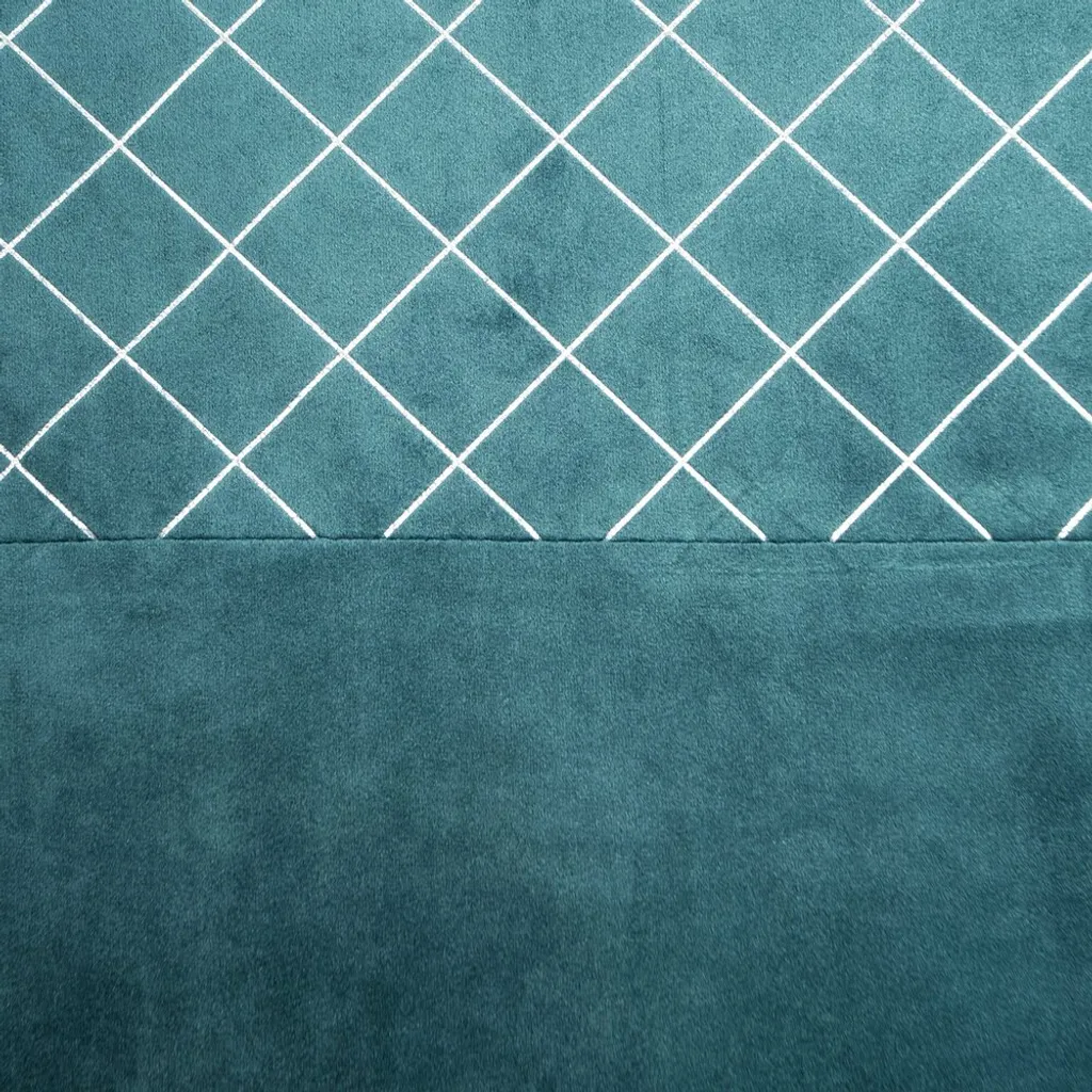 Фата сшита из приятного на ощупь бархата, украшена в верхней части широким поясом, украшенным серебряным геометрическим принтом. Геометрический ромбовидный узор ярко выделяется на фоне гладкого бархата внизу, создавая современную композицию для стильного интерьера. Штора легко подвешивается на карниз – для этого имеются люверсы, благодаря которым занавеску можно быстро и легко заменить, а ткань после подвешивания укладывается мягкими и равномерными волнами. Более толстая ткань превосходно изолирует солнечный свет и обеспечивает приятный микроклимат в помещении.