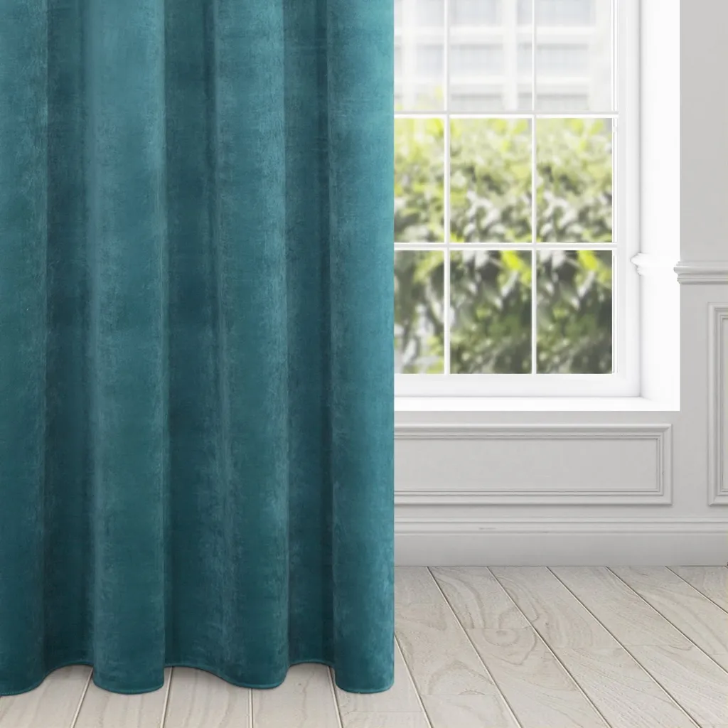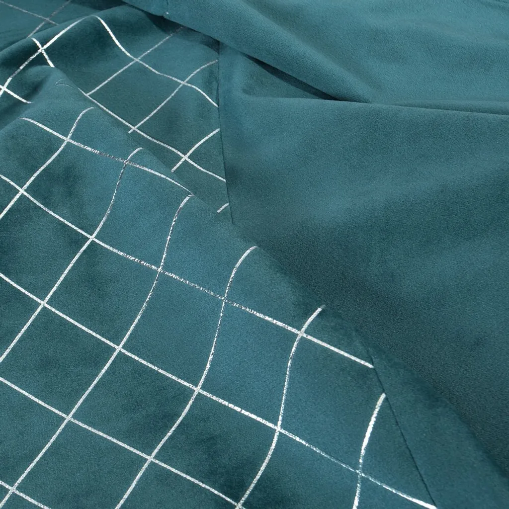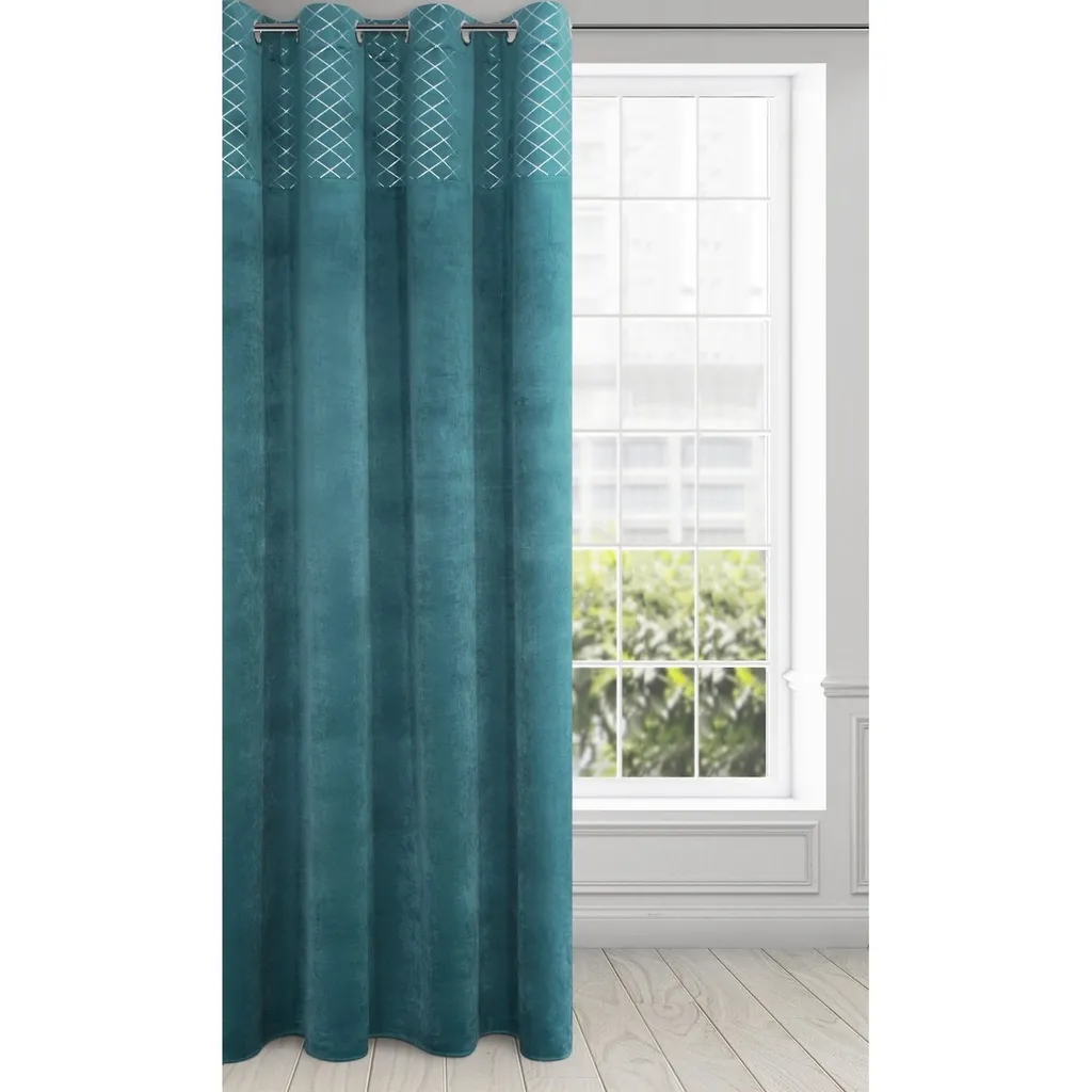 Фата сшита из приятного на ощупь бархата, украшена в верхней части широким поясом, украшенным серебряным геометрическим принтом. Геометрический ромбовидный узор ярко выделяется на фоне гладкого бархата внизу, создавая современную композицию для стильного интерьера. Штора легко подвешивается на карниз – для этого имеются люверсы, благодаря которым занавеску можно быстро и легко заменить, а ткань после подвешивания укладывается мягкими и равномерными волнами. Более толстая ткань превосходно изолирует солнечный свет и обеспечивает приятный микроклимат в помещении.