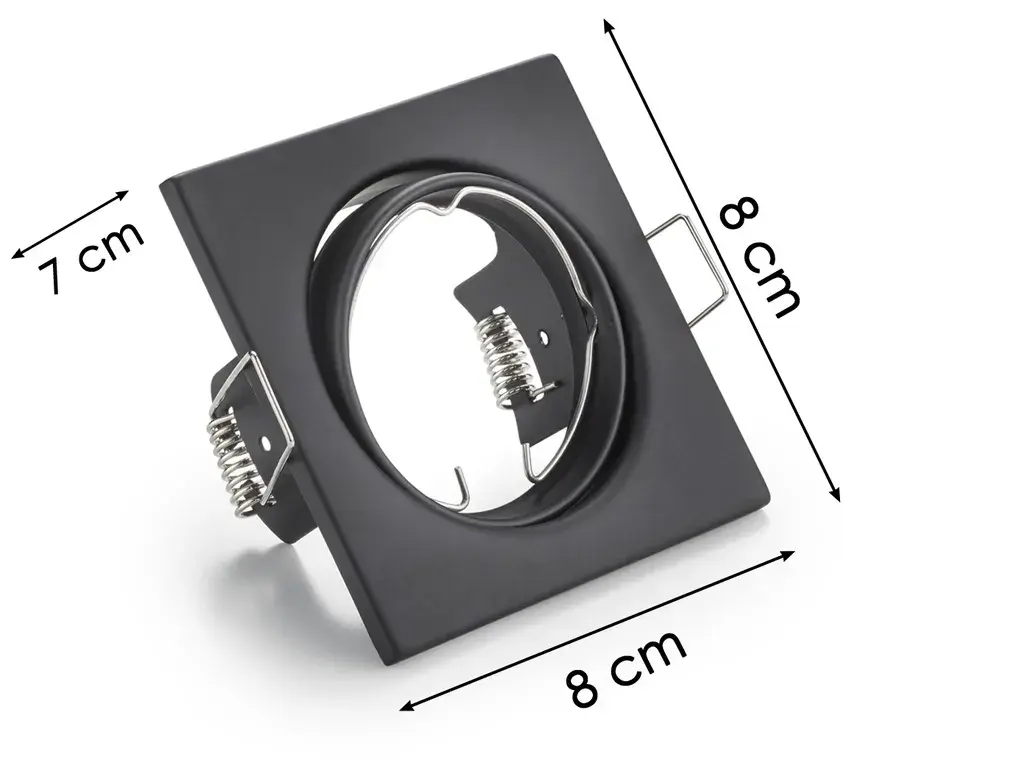 Потолочный светильник изготовлен из черного матового металла. Пятно имеет размер 8 х 8 см и глубину установки 9 см и может быть индивидуально выровнено. Встраиваемый светильник оснащен цоколем GU10 и подходит для лампы мощностью до 15 Вт.