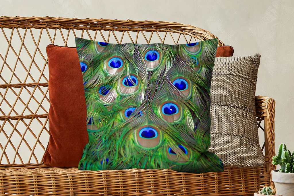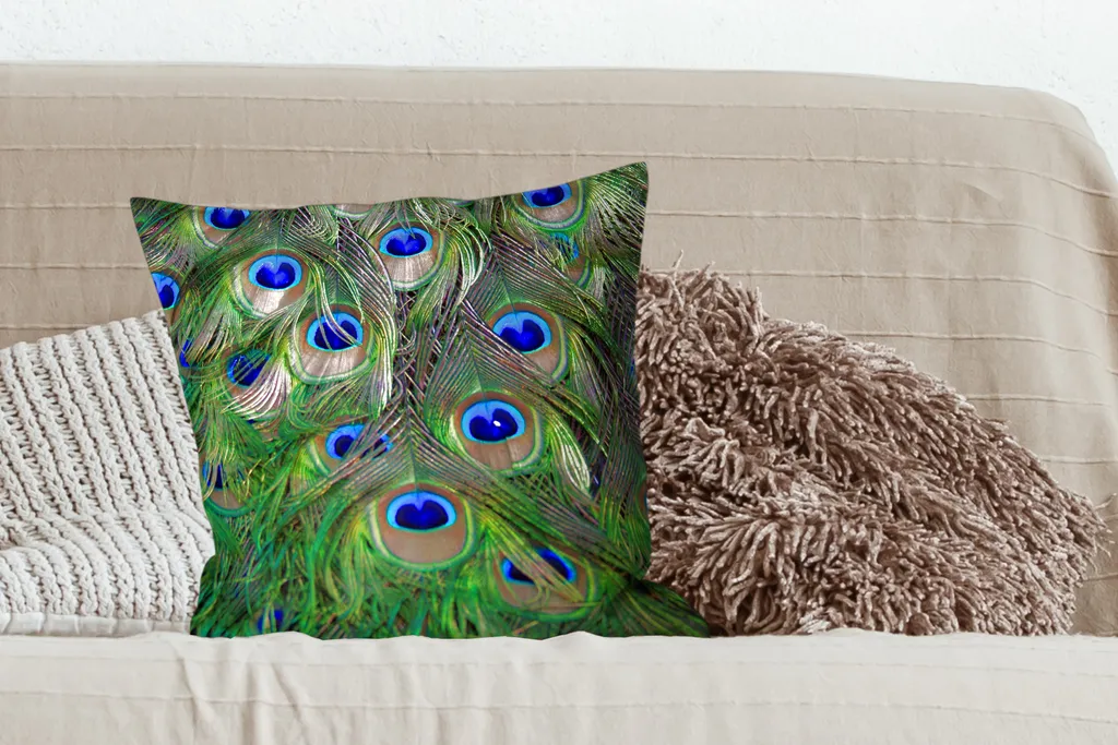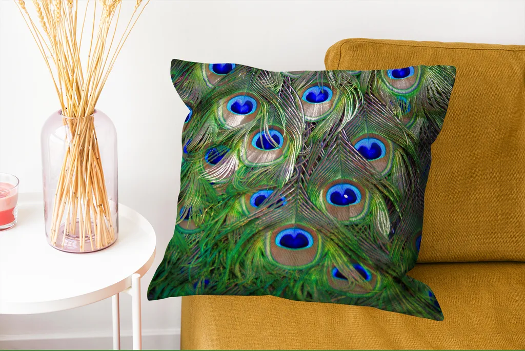 Крупный план зеленых и синих хвостовых перьев павлина.Доставка товаров осуществляется курьером или на пункт выдачи заказов.