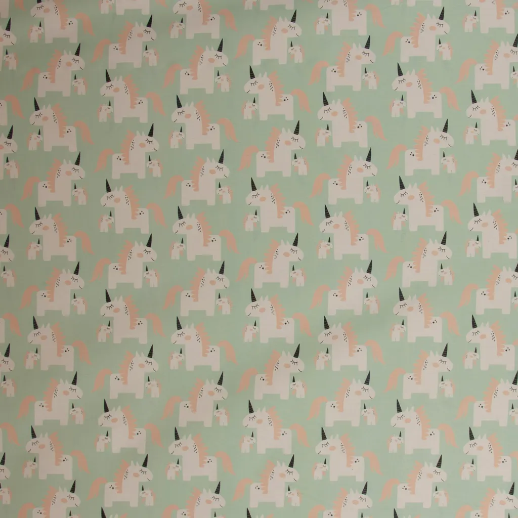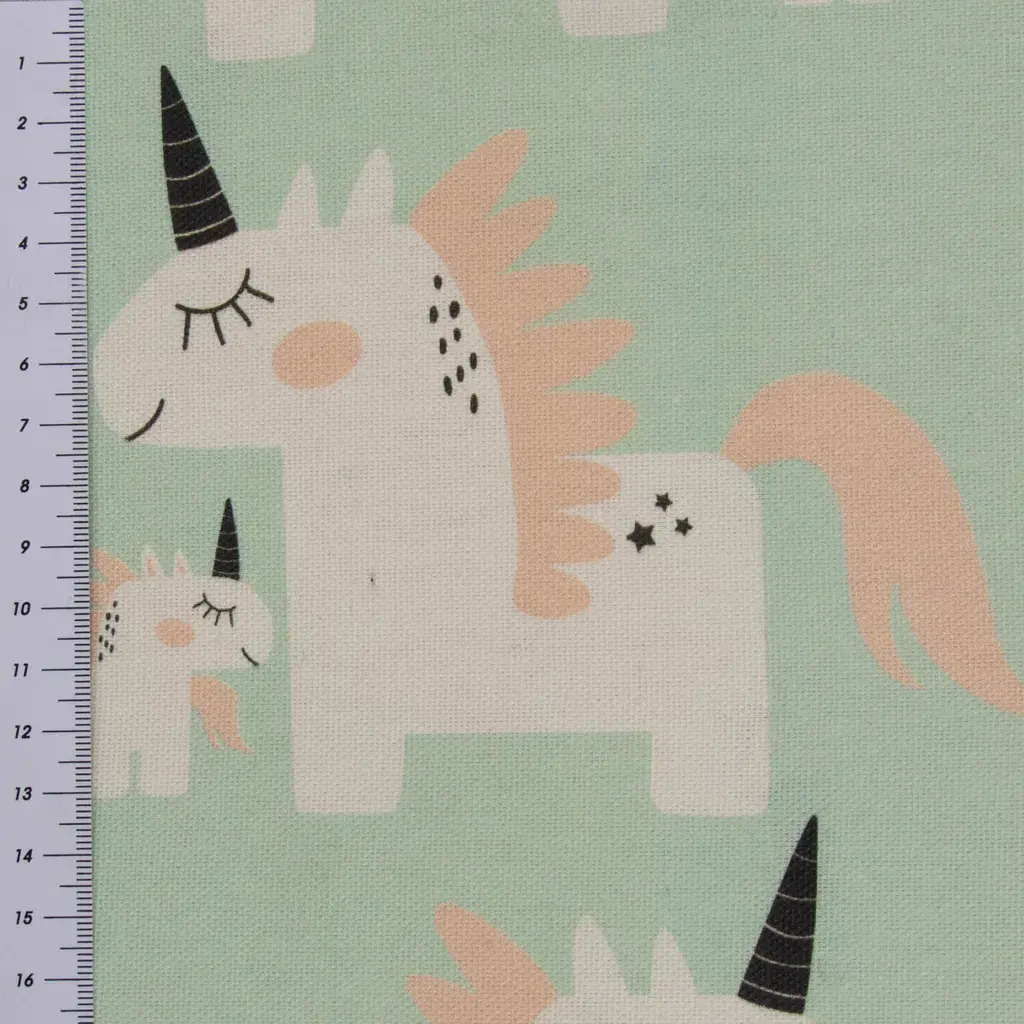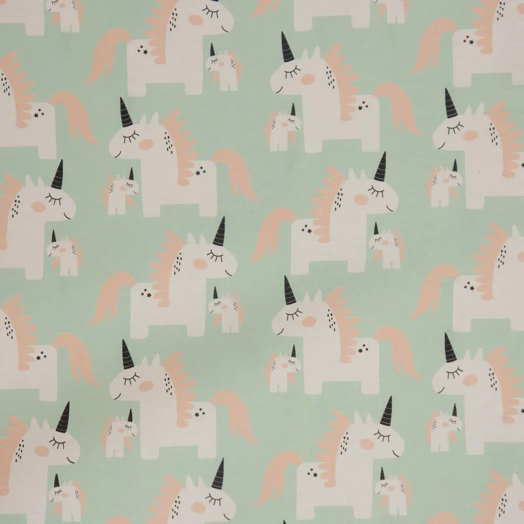 • Вы получите чехол для подушки из полупанамского переплетения с принтом белых единорогов с розовой гривой и черным рогом на мятном фоне.