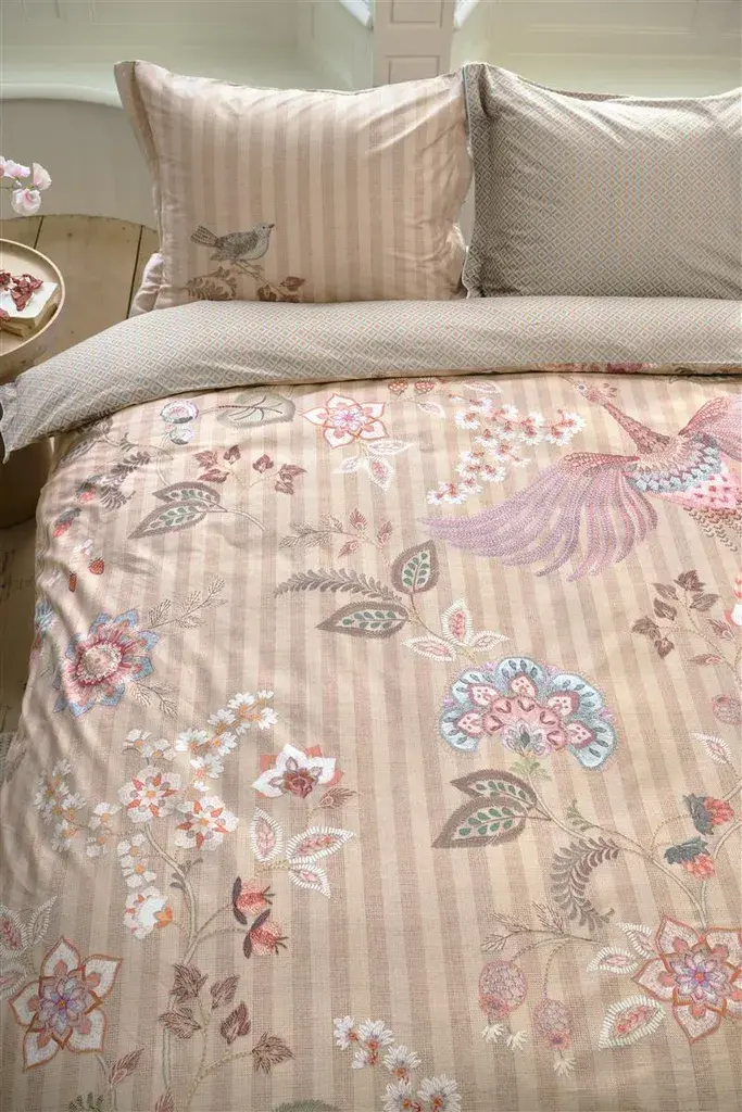 P Studio придаст вашей спальне нотку романтики. Искусно выполненные цветы и растительные орнаменты образуют красивый цветочный узор. Мотив павлина выделяется на бежевом полосатом фоне и делает элегантный комплект кровати настоящей приманкой для глаз. Спинка выполнена в бежево-синем ромбовидном узоре и идеально гармонирует с передом. На наволочке можно увидеть маленькую птичку. Устройтесь поудобнее на гладкой и приятной поверхности перкаля из 100-процентного хлопка и наслаждайтесь комфортным и спокойным сном. Постельное белье поставляется в эксклюзивной подарочной упаковке.