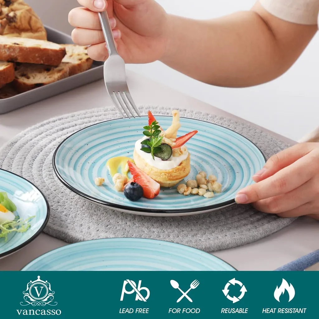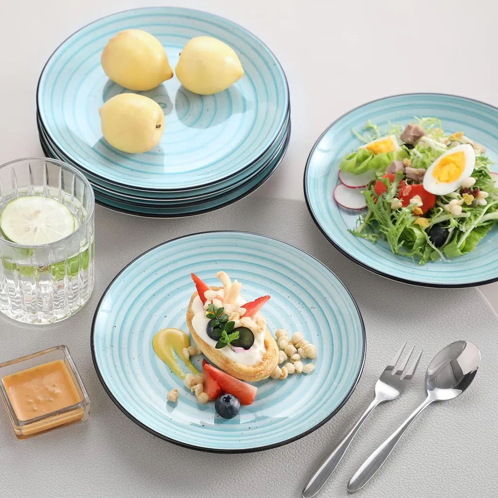 В качестве достойного подарка Великолепный набор посуды гармонично сочетает в себе типичные круглые формы и яркий современный вид, идеально подходящий для всех возрастов, семей и друзей. Супербезопасно и плотно упаковано. Этот комбинированный набор сервизов подходит не только для торжественных случаев, таких как семейные торжества, рестораны, вечеринки, банкеты и другие деловые помещения, но и для повседневного использования. Тарелки изготовлены из высококачественного и экологически чистого керамогранита, их можно мыть в посудомоечной машине и использовать в микроволновой печи. Они расписаны вручную, имеют элегантные линии, уникальный декор и современную эстетику, которые сделают ваш стол шикарным. Наши керамические десертные тарелки дважды обжигаются при высоких температурах, чтобы сделать их прочными и устойчивыми к царапинам. Это делает их пригодными для повседневного использования. Эти тарелки размером 19,4 х 19,4 х 2,5 см достаточны для тортов, закусок, завтрака, хлеба и других вкусных блюд.