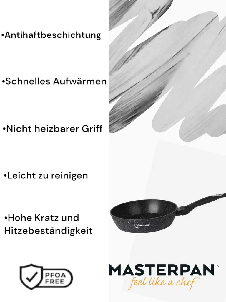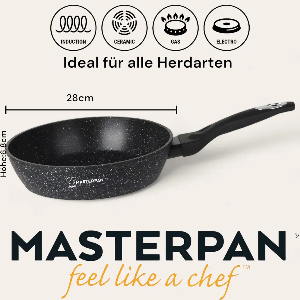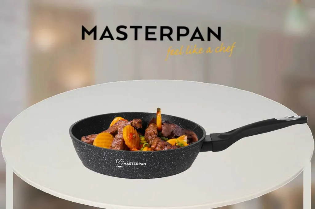Сковорода MASTERPAN сочетает в себе стиль и функциональность. Их современный, элегантный дизайн идеально вписывается в любую кухню, а прочная конструкция обеспечивает длительный срок службы. Это идеальная посуда, которая не только удовлетворит все ваши кулинарные потребности, но и впечатляет своим внешним видом, что делает ее идеальным дополнением к вашему кухонному оборудованию. Посуда, которая гарантирует не только исключительную производительность, но и эстетику!