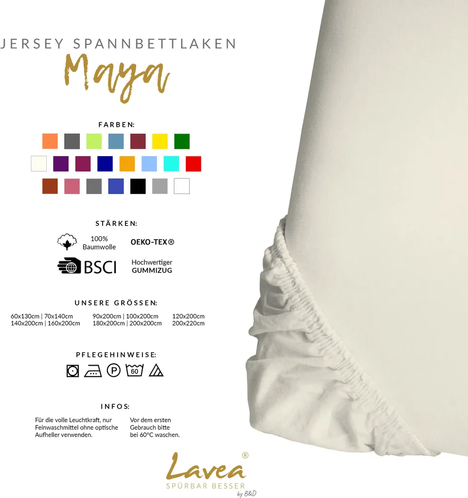 Сделано Простыня Lavea, изготовленная из 100% тончайшего хлопка, предлагает вам особенно приятный интерфейс. Используемый хлопок сертифицирован OEKO-TEX (рег. 2011PK0067), что гарантирует, что наша продукция не содержит вредных веществ и производится экологически чистым способом. Именно так мы всегда обеспечиваем высочайшее качество и экологичность всей нашей продукции.