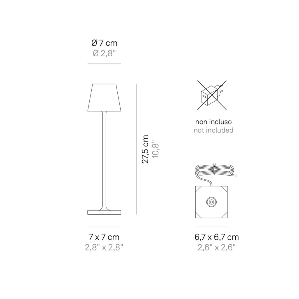 цвет света Poldina Pro Micro варьируется от слегка теплого света (2200 К), теплого света (2700 К) и очень теплого света (3000 К). ). Динамический белый. Poldina Pro Micro — настольная светодиодная лампа от бренда Zafferano. Размеры: Ø7 х 27,5 см в высоту. Базовые размеры: 7х7 см.