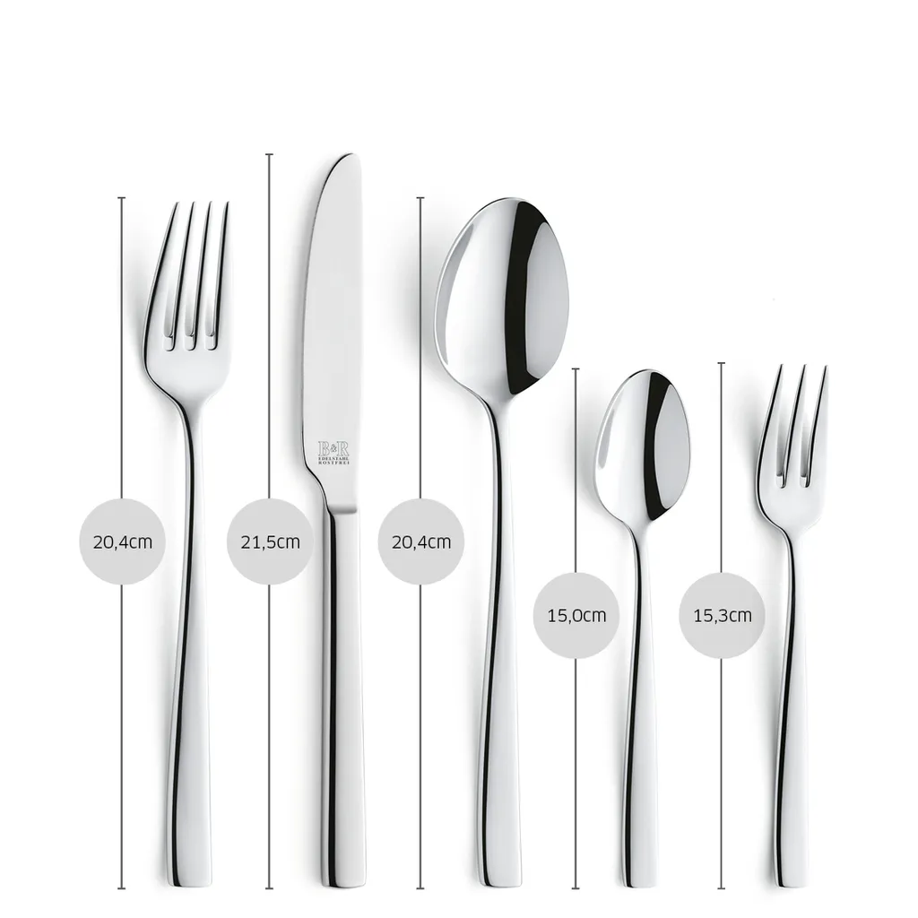 В комплект входит: 12 кофейных ложек, 12 вилок для торта, 12 обеденных вилок, 12 обеденных ложек, 12 обеденных ножей