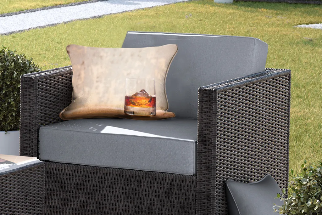 Подушка изготовлена из полиэстера, что делает ее устойчивой к атмосферным воздействиям и водонепроницаемой. Даже в сильный ливень материал не впитывает дождь, а просто скатывается! Это делает подушки идеальными для садового набора.