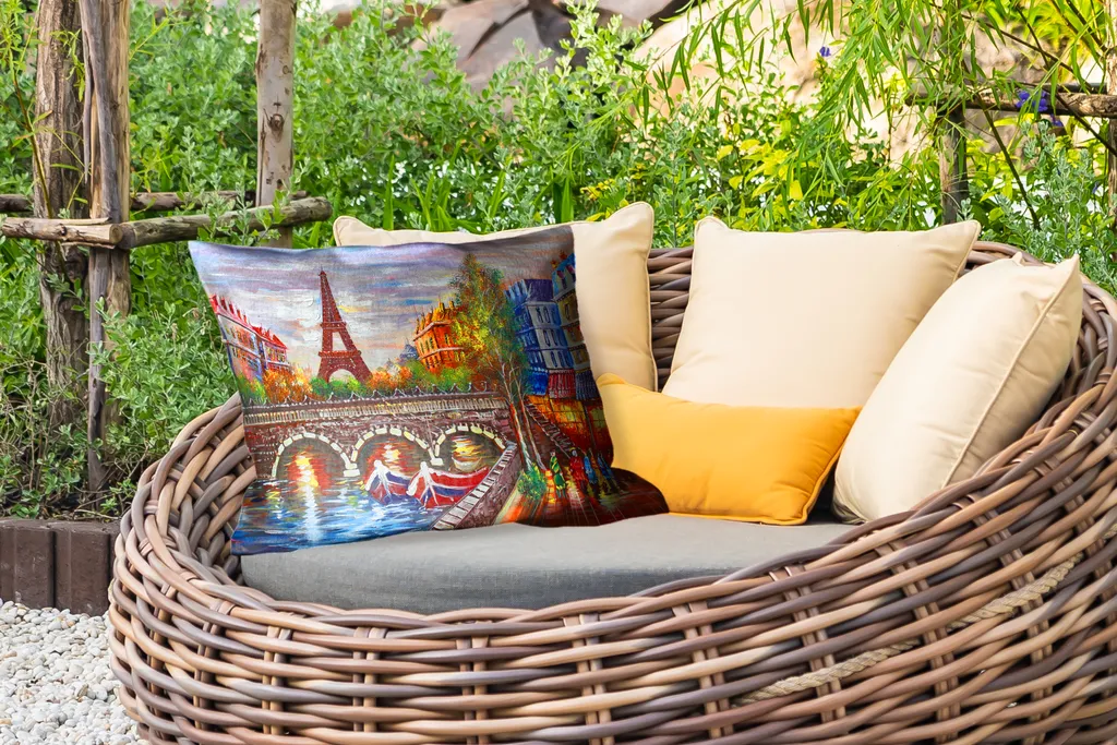 Подушка изготовлена из полиэстера, что делает ее устойчивой к атмосферным воздействиям и водонепроницаемой. Даже в сильный ливень материал не впитывает дождь, а просто скатывается! Это делает подушки идеальными для садового набора.