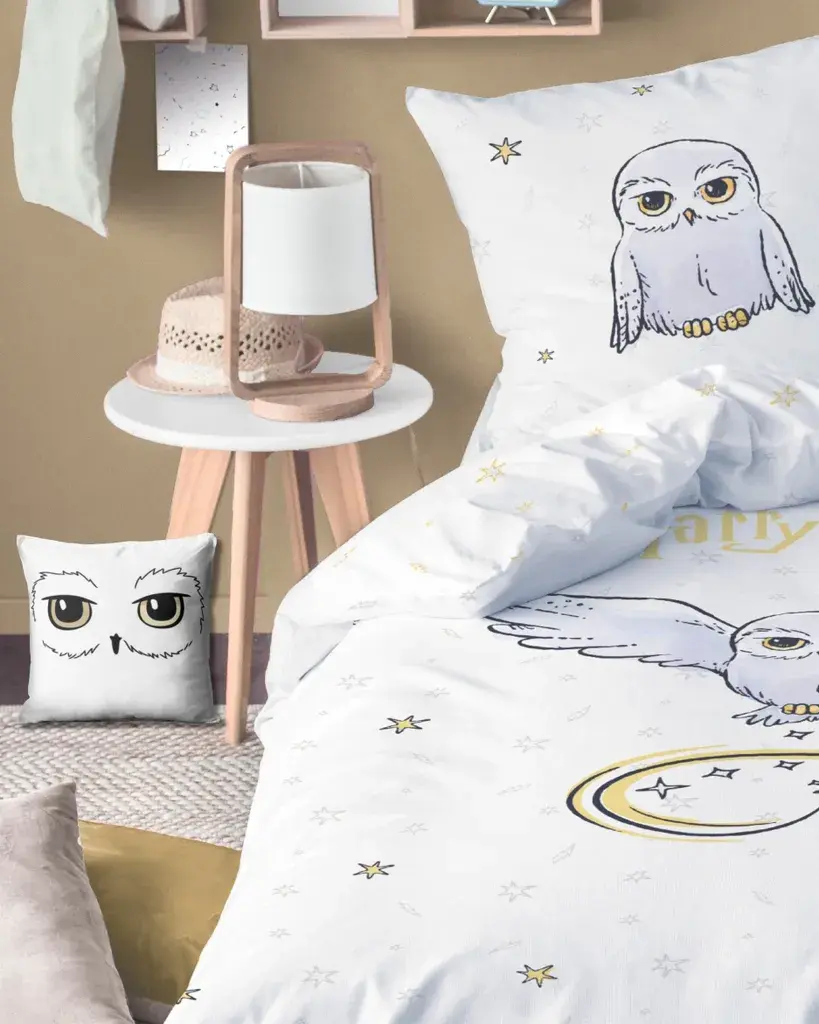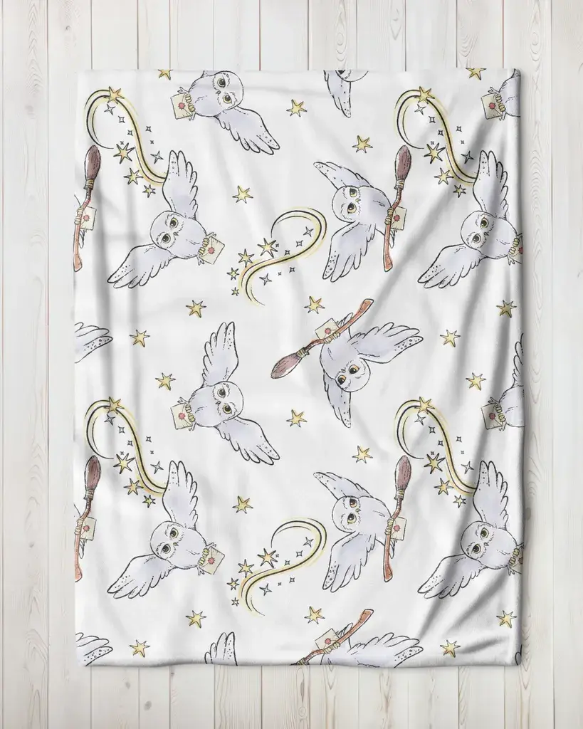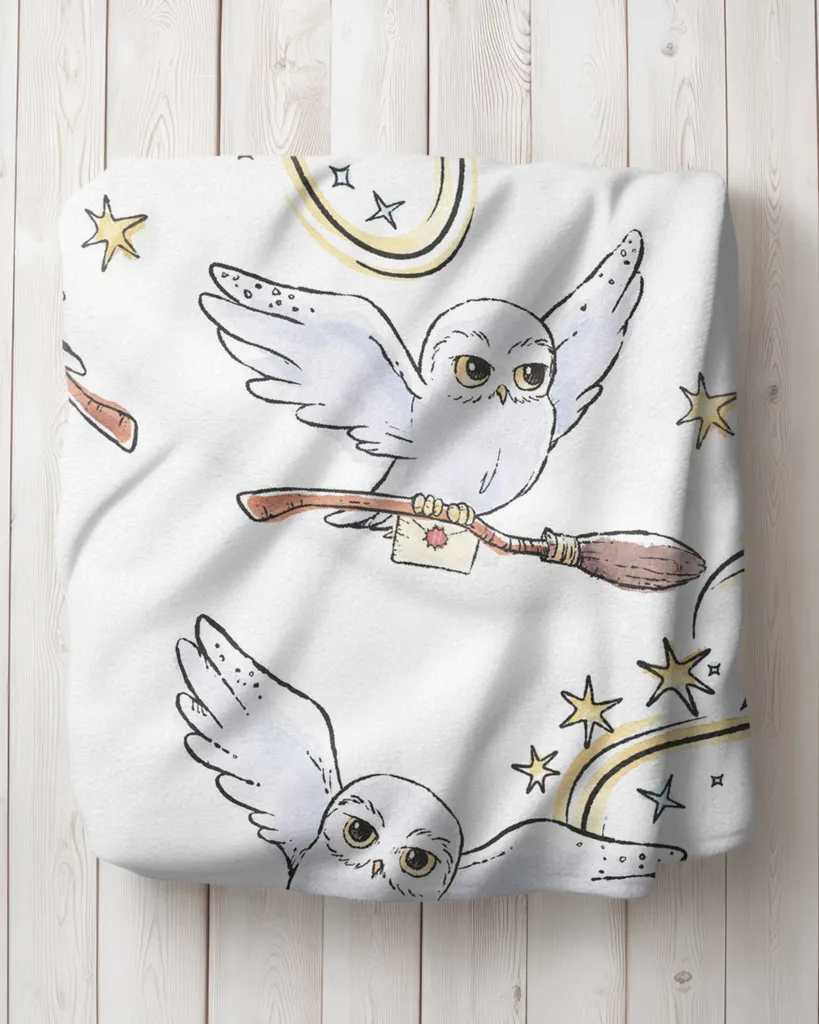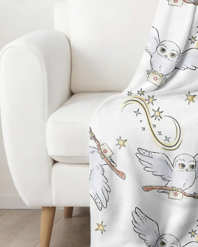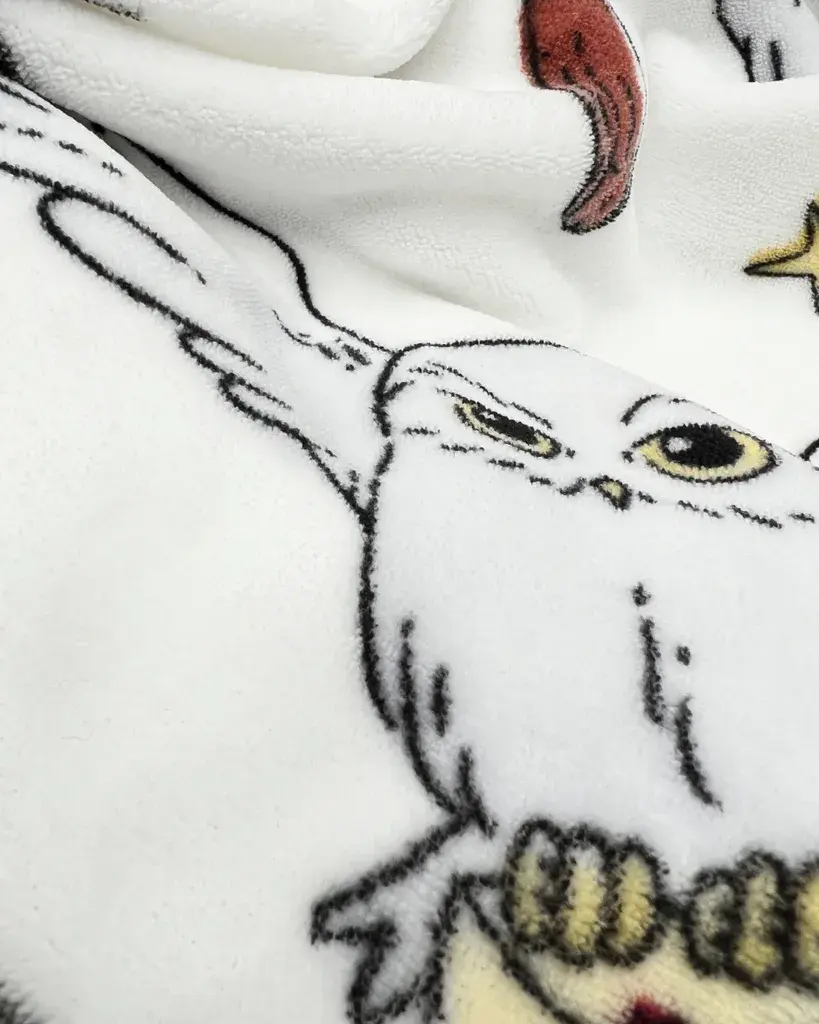 Откройте для себя наши волшебные Набор 2-в-1: мягкое одеяло «Хедвиг» в стиле Гарри Поттера и наволочка в тон. Идеально подходит для настоящих фанатов и ценителей комфорта! Эта инновационная комбинация предлагает вам две практические функции в одном продукте. Мягкое одеяло размером 120х150 см изготовлено из очень мягкого кораллового флиса из 100% полиэстера, который дарит приятное тепло и уют. Что особенного: одеяло можно легко хранить в подходящей наволочке (35х35 см). Благодаря продуманной конструкции застежек вы можете надежно хранить одеяло в чехле и использовать его в качестве декоративной подушки. Высококачественный принт совы в стиле Гарри Поттера делает этот комплект притягивающим взгляды — на диване, в постели или во время путешествия. Идеально подходит для всех, кто вдохновлен волшебным миром Хогвартса и в то же время любит практичный уют. Просто сложите его, сохраните и позвольте ему очаровать вас!