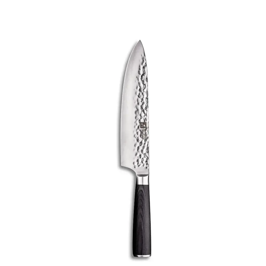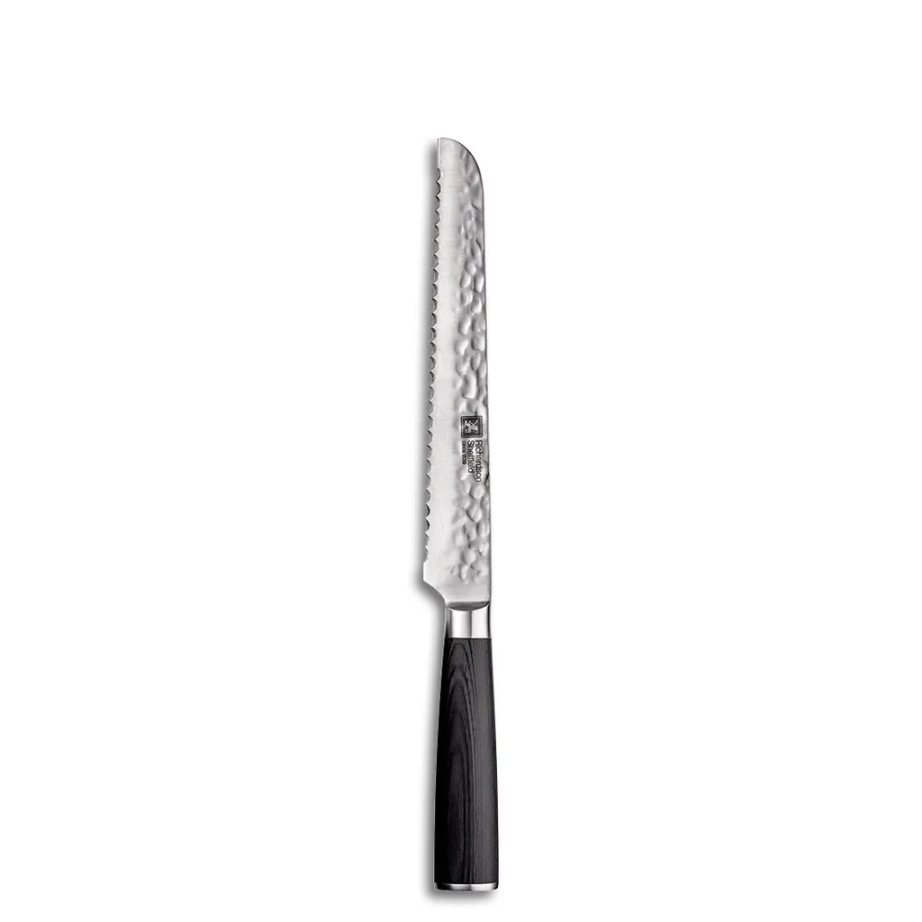 Блок ножей UTA впечатляет своим лаконичным дизайном и набором из 5 ножей. Лезвия поварских ножей впечатляют своей остротой и изысканным чеканным дизайном. Специальная сталь лезвия и хвостовик во всю длину обеспечивают стабильность и точность при резке.  Черный лаконичный дизайн Острое лезвие с молотковой отделкой Декор Элегантные деревянные ручки со стальным колпачком В комплекте: нож для очистки овощей (9 см), универсальный нож (12,5 см), нож для хлеба (20 см), разделочный нож (20 см), поварской нож (20 шт.). см) Материал: сталь лезвия, дерево, рекомендуется ручная чистка. Включая 5 ножей.