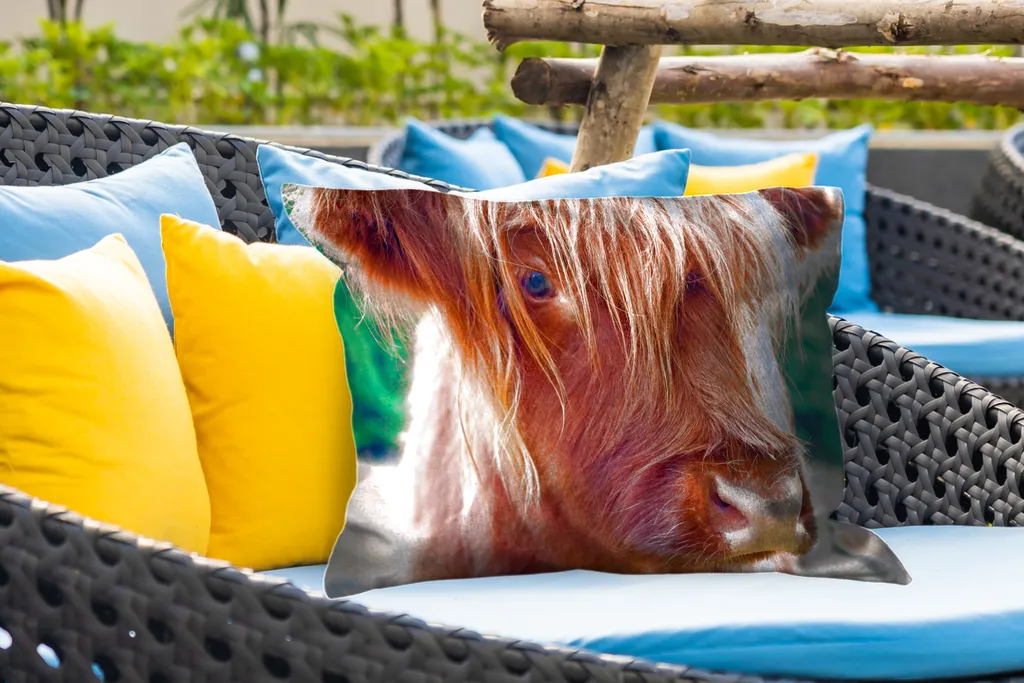 Теленок шотландского горца. Животное смотрит в камеру одним глазом.Доставка товаров осуществляется курьером или на пункт выдачи заказов.