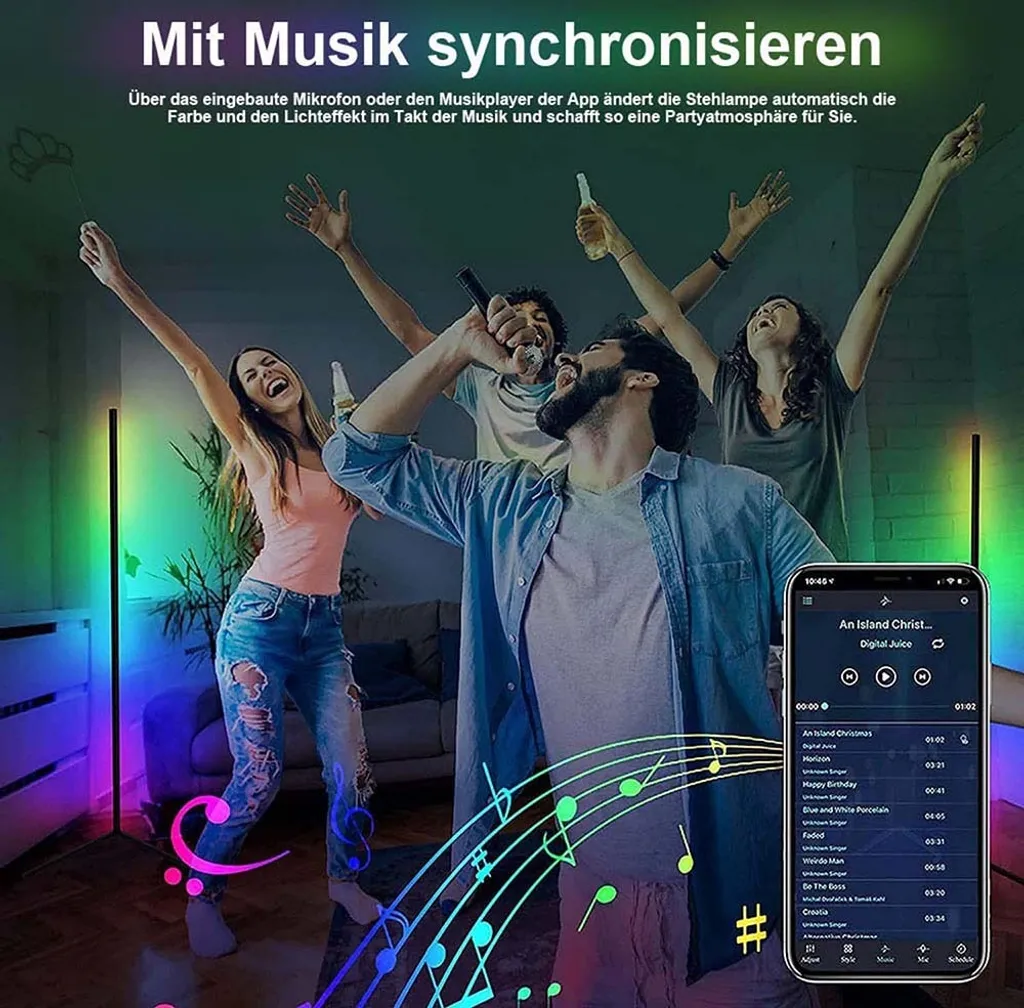 С помощью встроенного в приложение микрофона или музыкального проигрывателя торшер автоматически меняет цвет и световые эффекты в такт музыке, создавая атмосферу вечеринки.