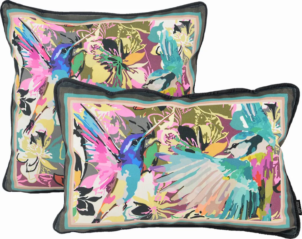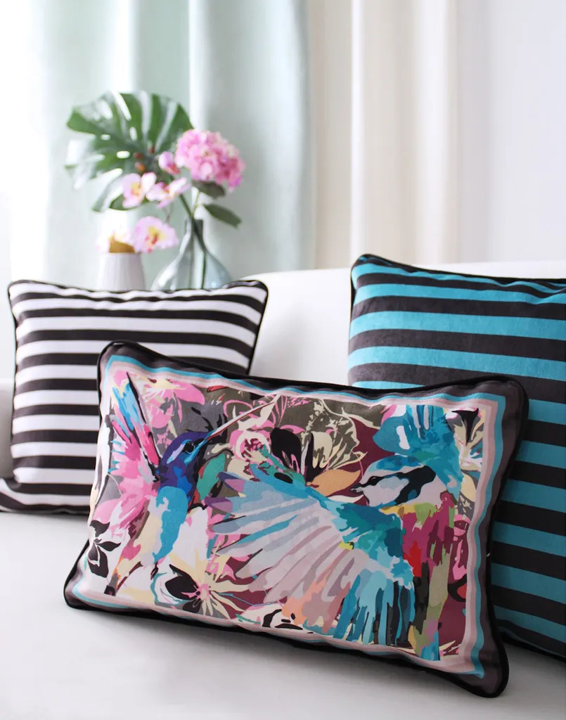 Эта декоративная подушка имеет красивые, яркие и насыщенные цвета. Птицы летают между цветами, художественный дизайн