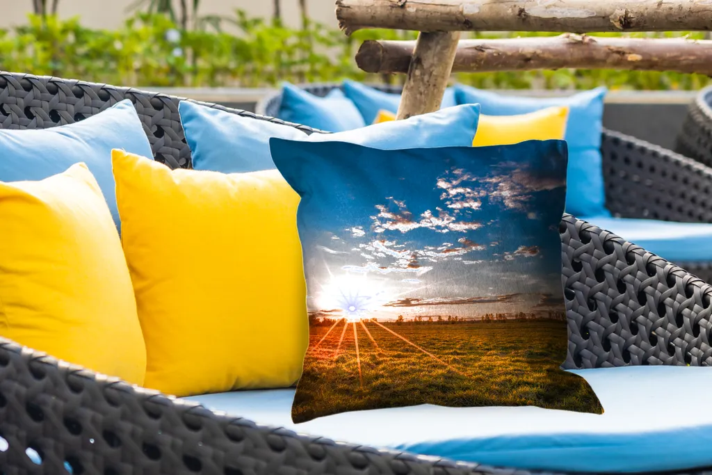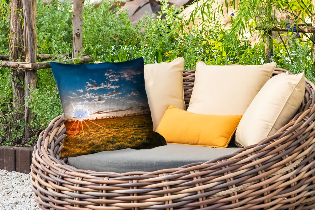 Подушка изготовлена из полиэстера, что делает подушку устойчивой к атмосферным воздействиям. и водонепроницаемый. Даже в сильный ливень материал не впитывает дождь, а просто скатывается! Это делает подушки идеальными для садового набора.