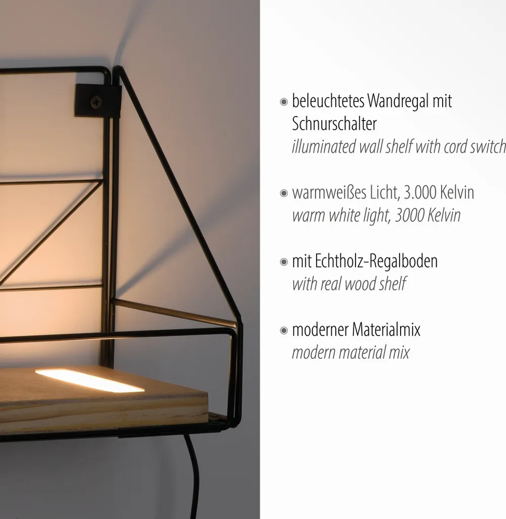 Эта светодиодная настенная полка идеально подходит для установки в коридоре или гостиной. Полка из натурального дерева оснащена светодиодами, которые мягко освещают пространство и обеспечивают непрямой теплый белый свет. Свет можно легко включать и выключать благодаря шнуровому выключателю.