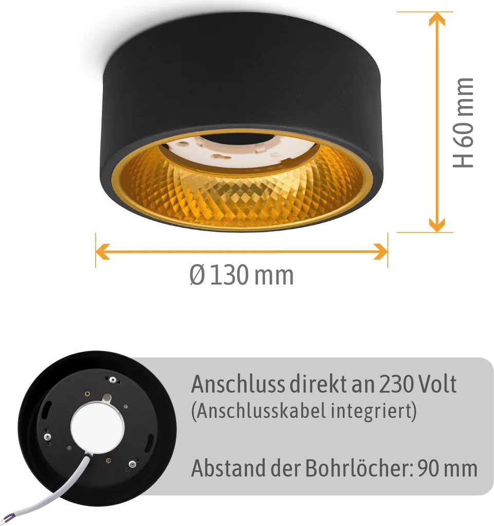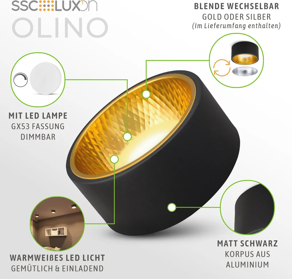 Потолочный точечный светильник OLINO для поверхностного монтажа предлагаетсменные крышки внутреннего кольца и бесступенчатую регулировку яркости.Выбор междузолотой и серебряной крышкой ,чтобы настроить внешний вид потолочных светильников. Золотой безель создает теплую атмосферу, а серебряный придает современную эстетику. Благодаря функции затемнения яркость можно регулировать в соответствии с любым настроением.
