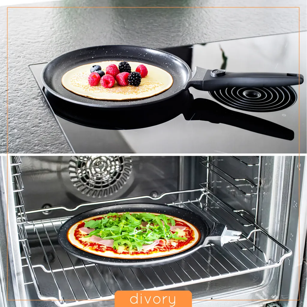 Съемная ручка: ручку можно легко снять и снова прикрепить одним нажатием кнопки. Благодаря этому сковороду можно мыть в посудомоечной машине и готовить в духовке при температуре до 230 градусов.