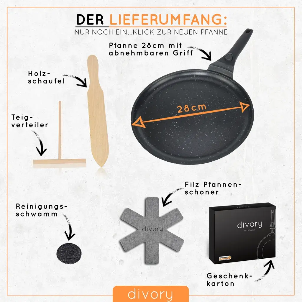 В комплекте: дозатор теста, противень Ø 28 см, фетровая защита для противня, подарочная упаковка, деревянная вращатель, губка для чистки, съемная ручка