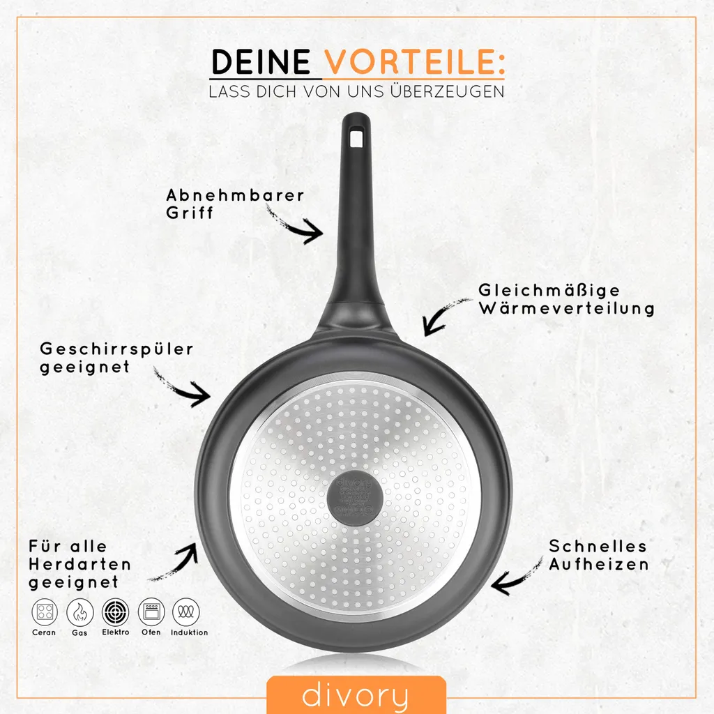 Индукция: основание, способное к индукции, передает тепло быстро и равномерно. Оптимальное сохранение тепла. Сковороды подходят для всех типов плит. (Электрическая плита, газовая плита, стеклокерамическая плита и индукционная плита)