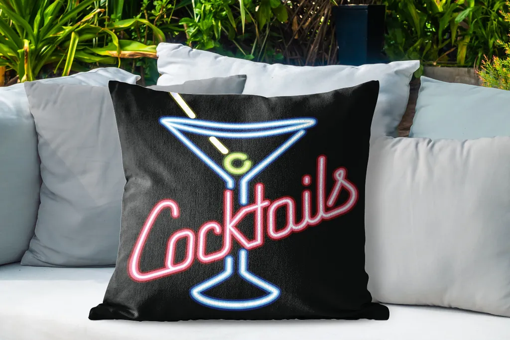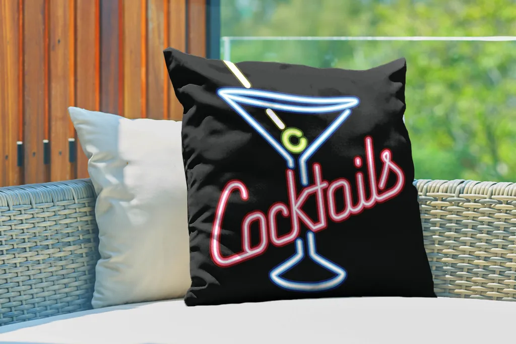 Иллюстрация неоновой вывески бара со словом «Коктейли». Логотип — мартини, напиток с оливкой.Доставка товаров осуществляется курьером или на пункт выдачи заказов.