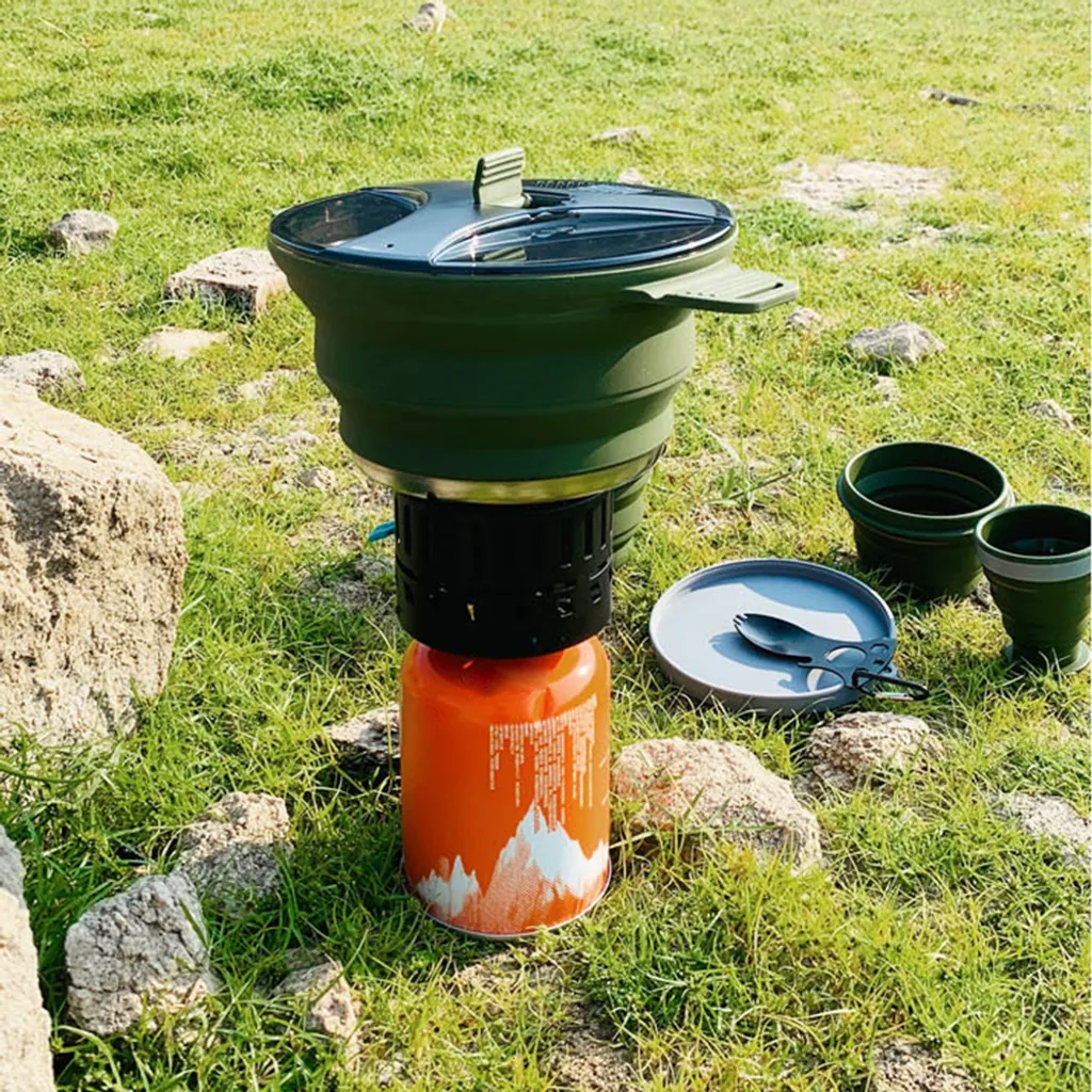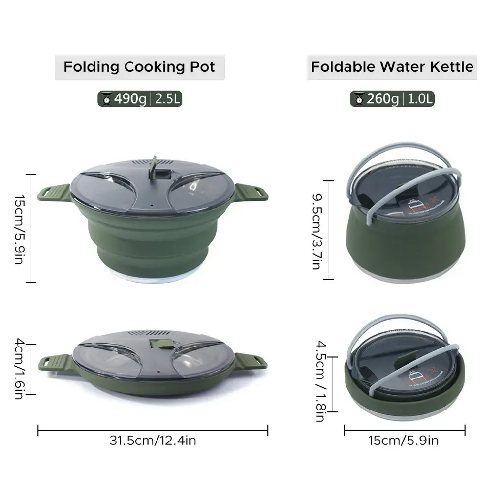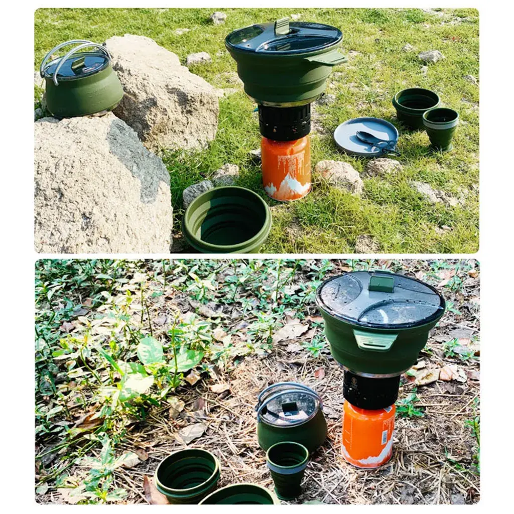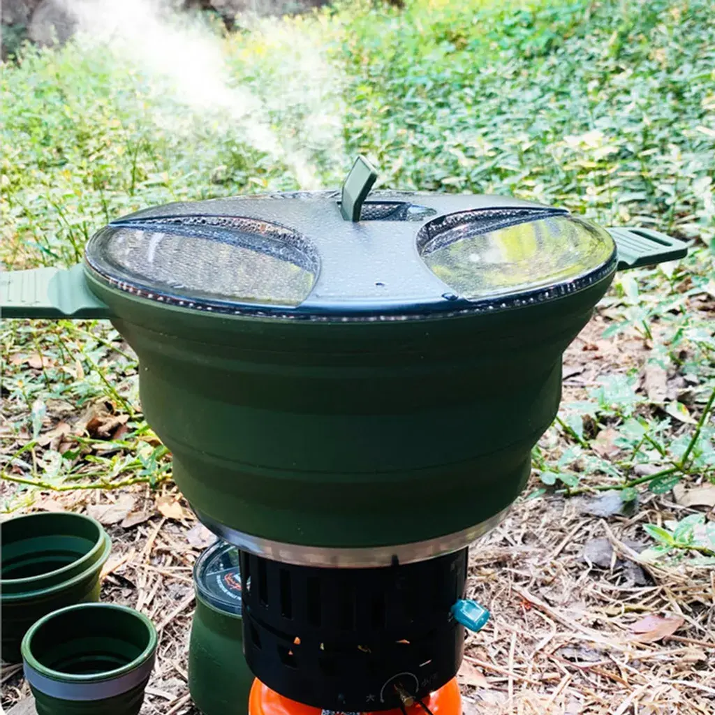 Эта складная походная кастрюля, изготовленная из пищевого силикона и нержавеющей стали 304, имеет уникальный дизайн и удобна в переноске, что делает ее идеальной кухонной утварью для кемпинга и пеших прогулок.