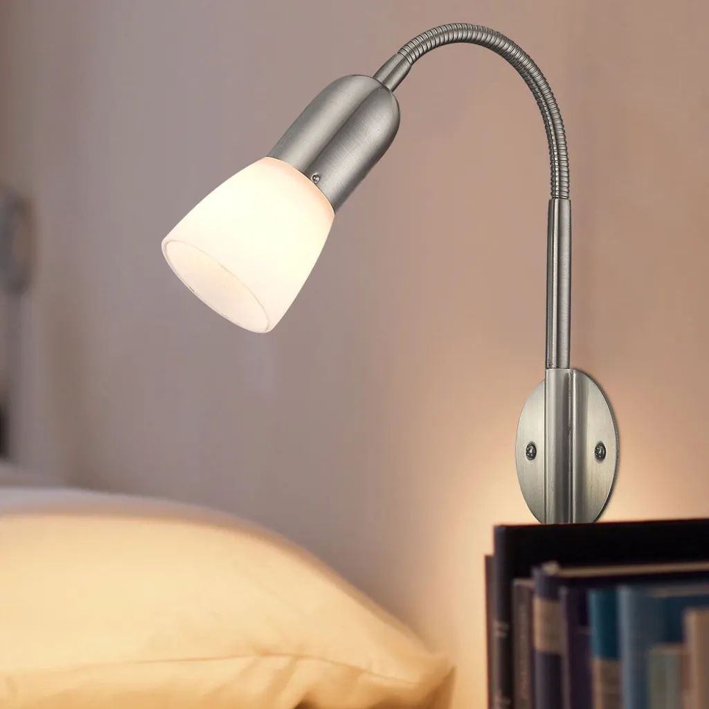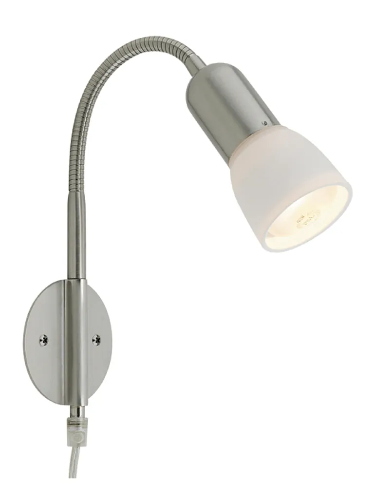 Описание Настенный точечный светильник в традиционном стиле впечатляет своим внешним видом и материалом. Этот точечный светильник из матового никеля, прикрепленный к гибкому кронштейну, имеет соединительный кабель длиной 1,5 метра, что делает область его использования очень гибкой. Благодаря встроенной розетке Е14 и свободному выбору источника света (макс. 40 Вт) вы можете самостоятельно определить интенсивность света и цвет света. Мы рекомендуем светодиодные лампы из-за их энергосбережения и долговечности. Лампа не входит в комплект поставки. В комплект поставки входят два светильника!