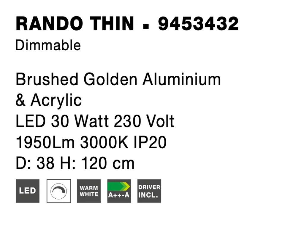Rando Thin — современный и стильный подвесной светильник минималистичного дизайна из алюминия и акрила. Встроенный источник света, встроенный во внутреннюю часть круга, обеспечивает красивое и хорошее распределение света. Рекомендуется разместить светильник в гостиной или над обеденным столом. Встроенный светодиод мощностью 30 Вт, яркостью 1950 лм и теплым белым светом 3000 К. Рандо также доступен в других вариантах.