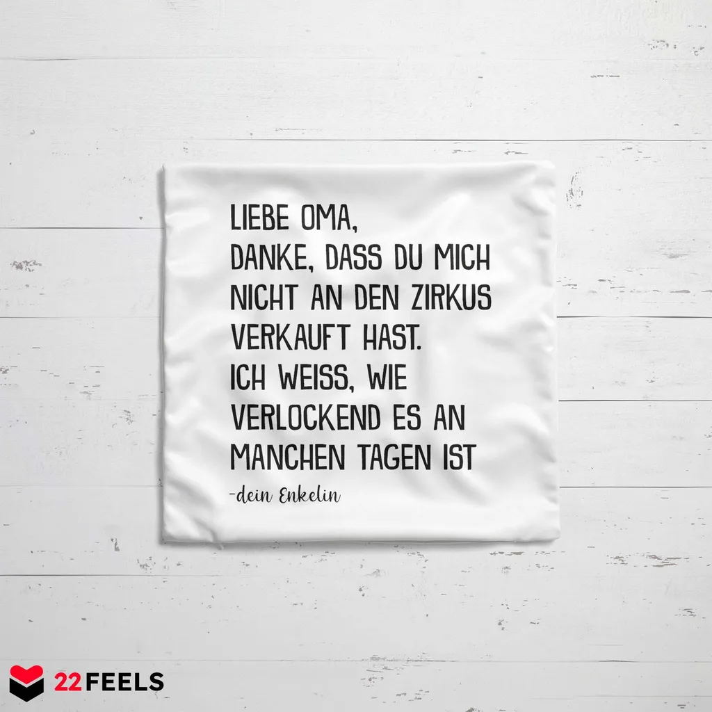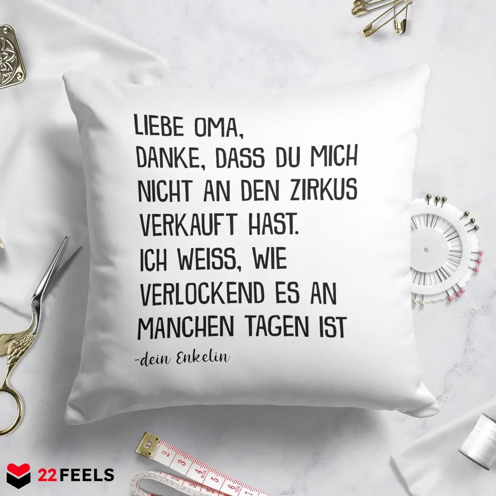 На чехле на подушке надпись: Дорогая бабушка, спасибо, что не продала меня в цирк. Я знаю, как это иногда бывает заманчиво - твоя внучка