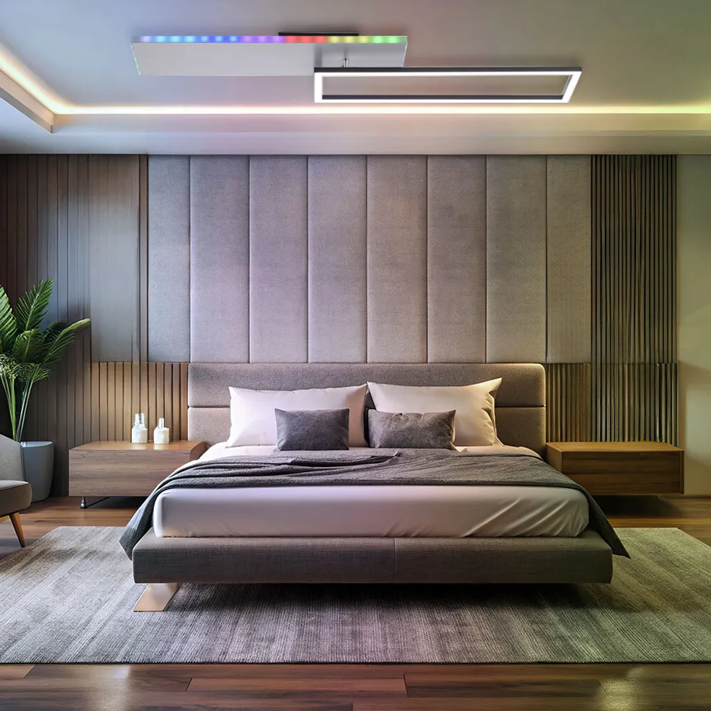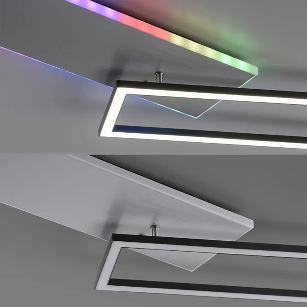 Описание Этот светодиодный потолочный светильник сочетает в себе универсальные возможности освещения с современным дизайном и позволяет вашему окружению сиять завораживающим светом. Потолочный светильник оснащен мощной светодиодной панелью, которая обеспечивает регулируемую цветовую температуру 2700–5000 К. Независимо от того, нужна ли вам теплая, уютная атмосфера для часов отдыха дома или яркий, освежающий свет для сосредоточенной работы – с лампой вы имеете полный контроль над интенсивностью света и цветовой температурой. Но это еще не все! Потолочный светильник оснащен боковой подсветкой Rainbow RGB, предоставляющей широкий выбор цветовых вариантов. Пусть ваши комнаты засияют, плавно меняя цвет, или выберите свой любимый цвет, чтобы создать особое настроение. Квадратный дизайн нашего светильника дополняется вращающейся осветительной рамкой, что дает вам возможность регулировать форму светильника по своему вкусу. Меняйте угол обзора и ориентацию светильника, чтобы реализовать свои индивидуальные дизайнерские идеи. С помощью входящего в комплект инфракрасного пульта дистанционного управления вы можете плавно регулировать яркость и отдельно переключать источники света для потолочного и бокового освещения. Идеально отрегулируйте свет в соответствии с вашими потребностями и создайте уникальную атмосферу в каждой комнате. А благодаря практичной функции памяти фонарь запоминает ваши настройки даже после выключения. Превратите свои комнаты во впечатляющие световые пейзажи и дайте волю своему творчеству. Источник света стационарно установлен в светильнике. Подробнее о лампе - Тип лампы: потолочный светильник - Материал: металл, пластик - Цвет: черный - Класс защиты: IP20