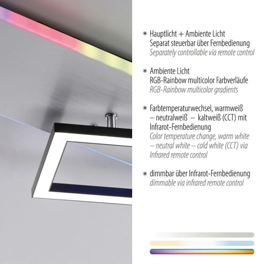 - Эффект радуги - Ночник функция - Схема CCT (2700–5000 К) - Длина x ширина x высота в см: 91x56x6 холодный белый (дневной свет) - Электропитание: 220–240 В, 50–60 Гц Подробности освещения - Тип источника света: LED