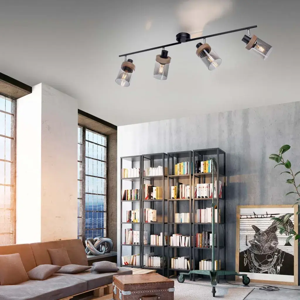 Настенные и потолочные светильники PASQUAL классической черной и круглой формы. Небольшой изюминкой выделяется деревянный элемент из каучукового дерева на каждом из четырех абажуров. Цилиндрические абажуры из дымчатого стекла, прикрепленные к изящной металлической направляющей, можно поворачивать, обеспечивая оптимальное и целенаправленное освещение. Потолочный светильник должен быть оснащен четырьмя лампочками Е27 максимальной мощностью 40 Вт. Поскольку лампы видны сквозь стеклянные плафоны, здесь особенно рекомендуются лампы накаливания.