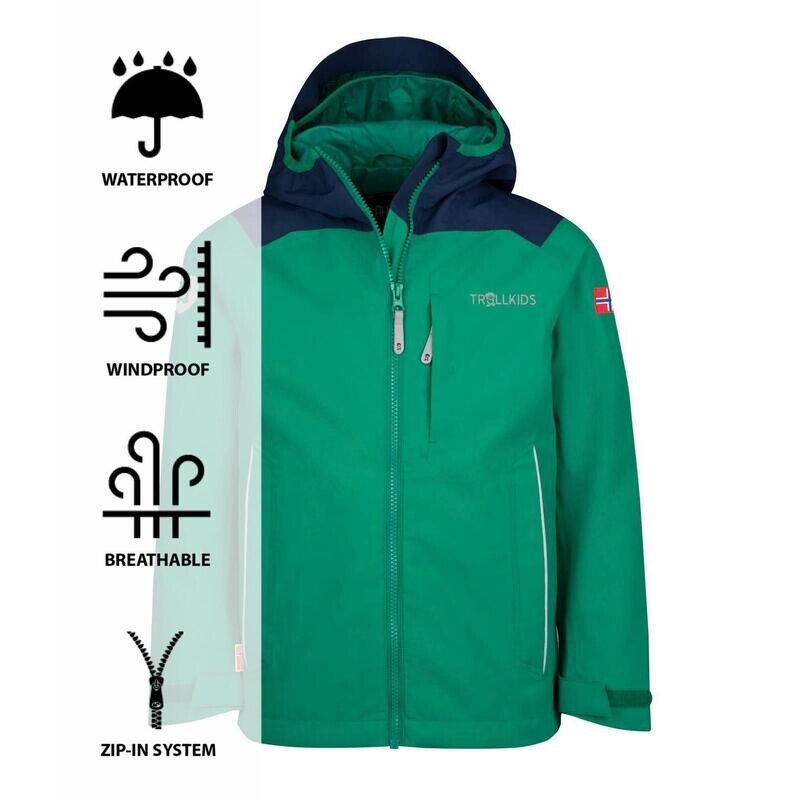 КУРТКА KIDS BERGEN JACKET – это почти классика TROLLKIDS. Популярная дождевик теперь доступна в новой версии, изготовленной из 100% переработанного полиэстера. Материал изготовлен из ПЭТ-бутылок.