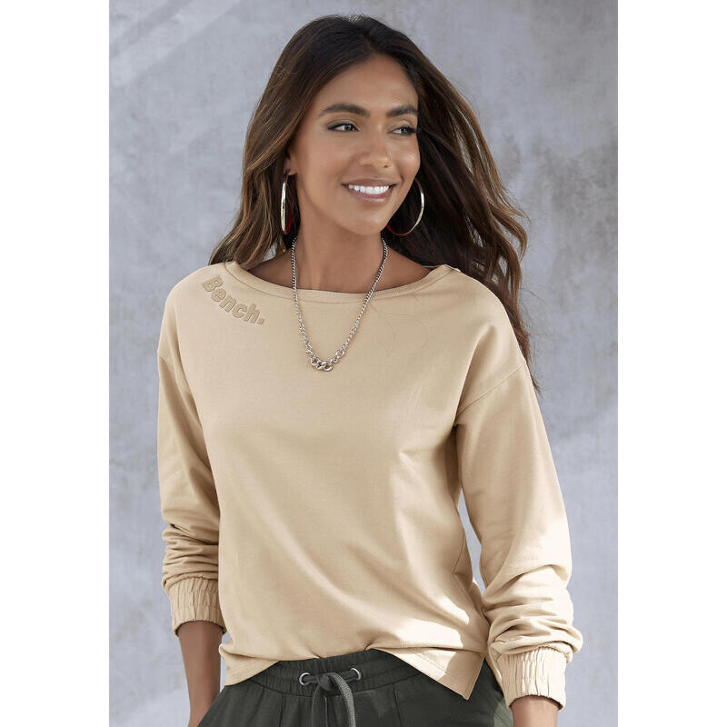 Модный свитшот от Bench. Принт логотипа в тон и удобный широкий круглый вырез. Манжеты со сборками. Очень легко создать образ для отдыха.