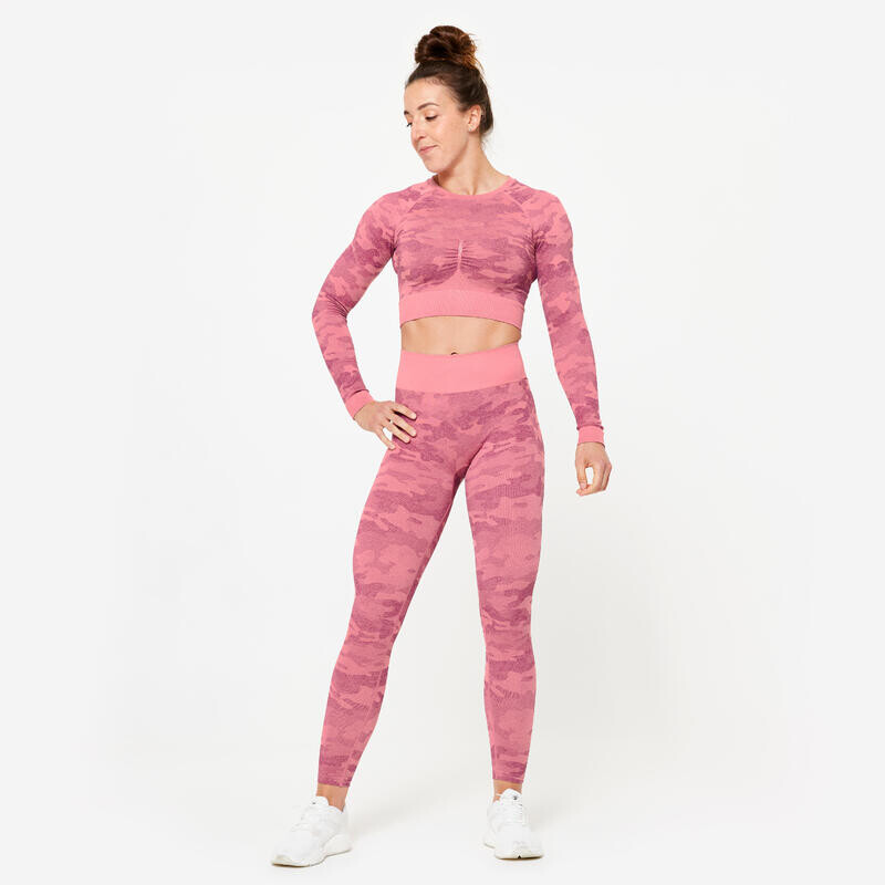 Эта рубашка подчеркнет ваши формы. Благодаря модному камуфляжному мотиву и укороченному крою эта женская рубашка с длинными рукавами выглядит абсолютно спортивно и женственно. Чтобы подчеркнуть ваши изгибы и мускулы, мы добавили оборки на уровне груди и пояс, который придаст спортивный вид и подчеркнет вашу фигуру. Этот бесшовный укороченный топ (без швов) обеспечивает оптимальный комфорт во время силовых тренировок.