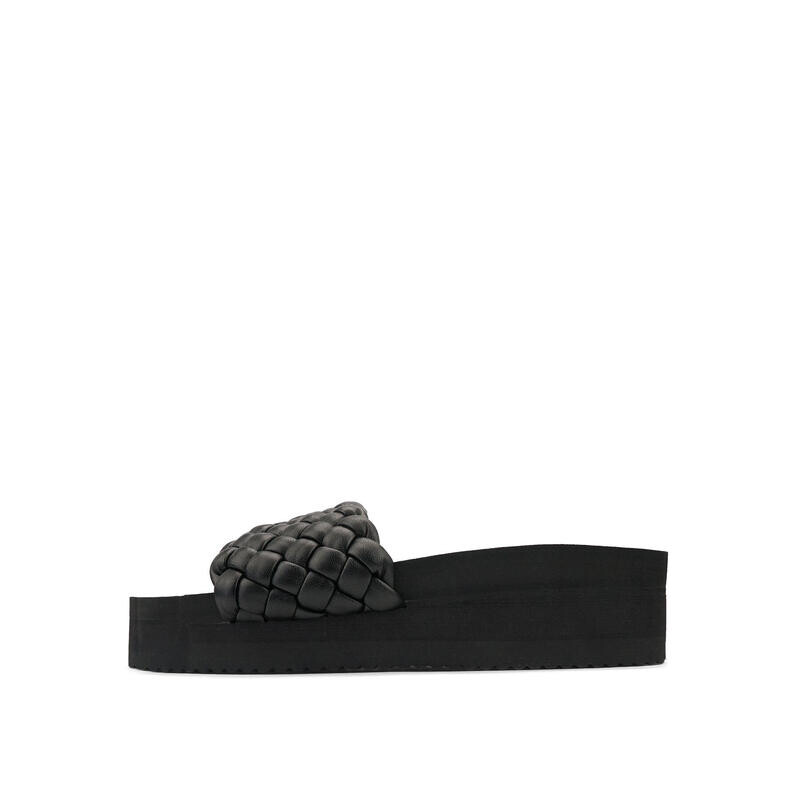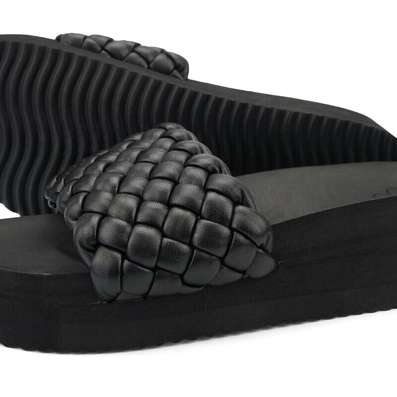 Ткань «poolhi» демонстрирует настоящий модный потенциал благодаря очень толстой подошве и плетеной (веганской) коже. Он также имеет нескользящую подошву с волнистым профилем.