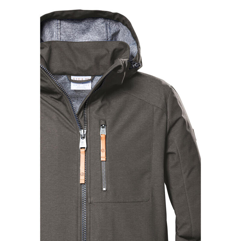 Куртка из софтшелла впечатляет своим неподвластным времени дизайном и меланжевой текстурой. Водоотталкивающая и ветрозащитная внешняя ткань с водяным столбом высотой 8000 мм обеспечивает защиту от атмосферных воздействий и оптимальный комфорт при ношении.