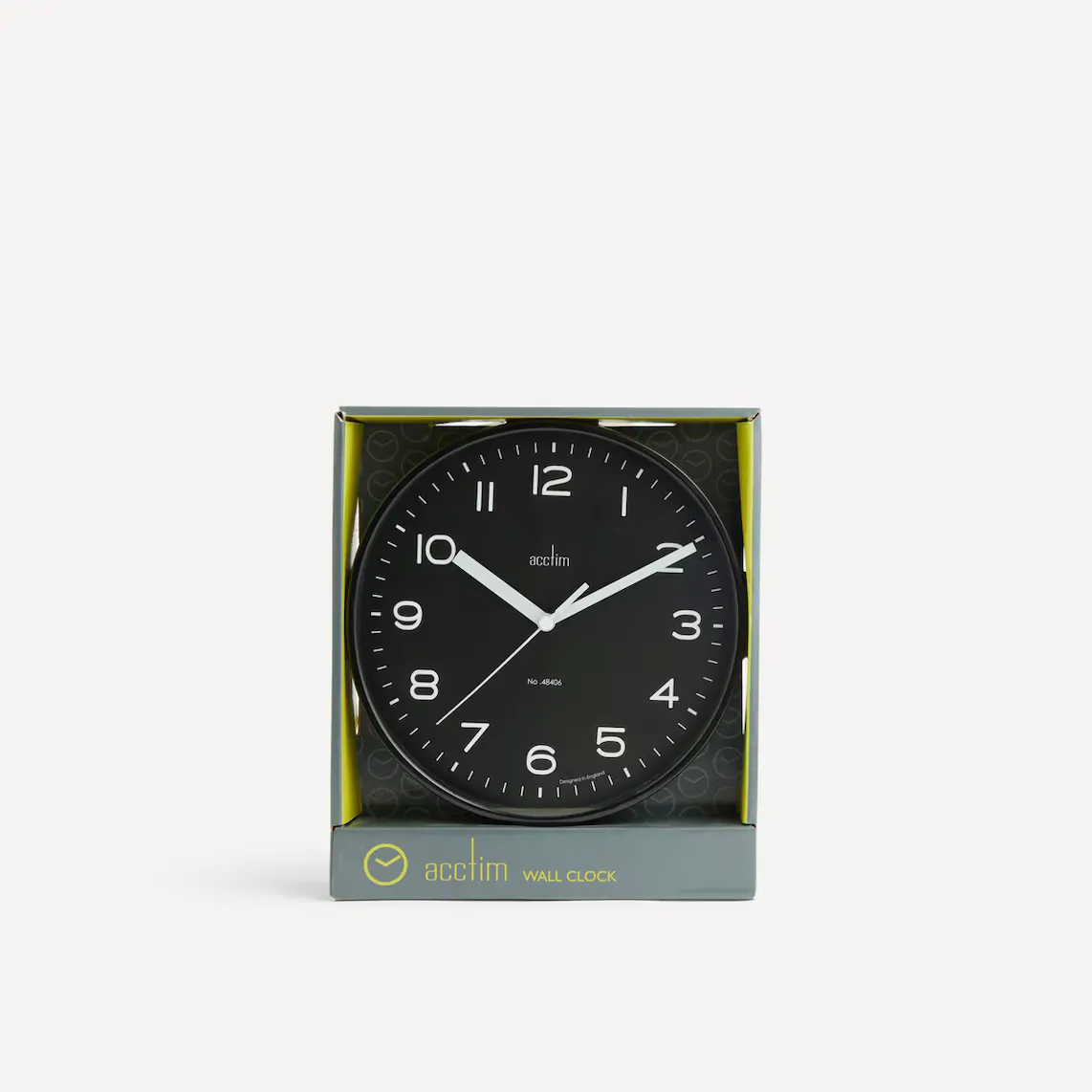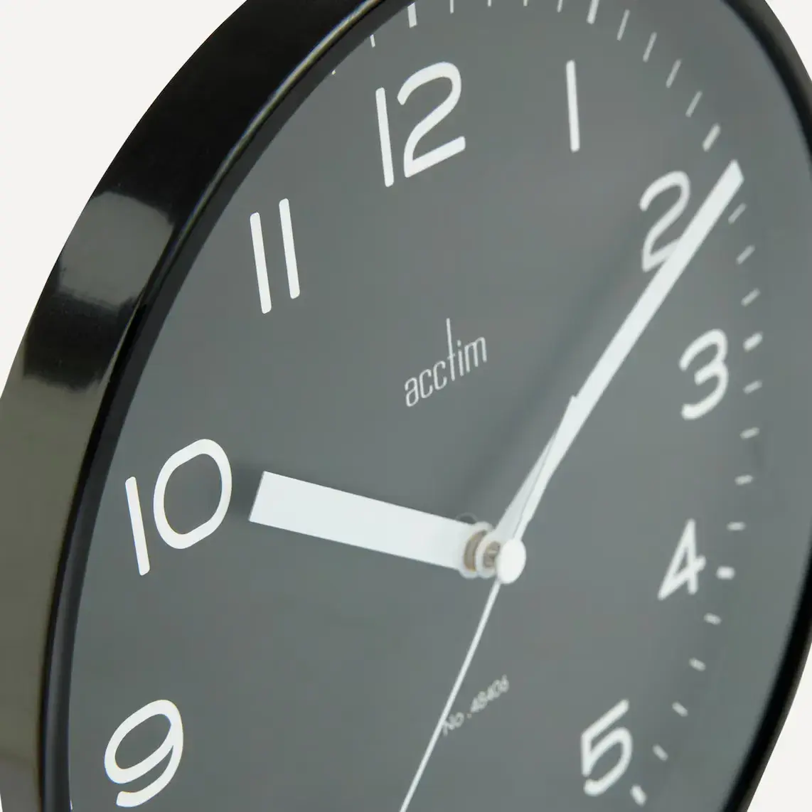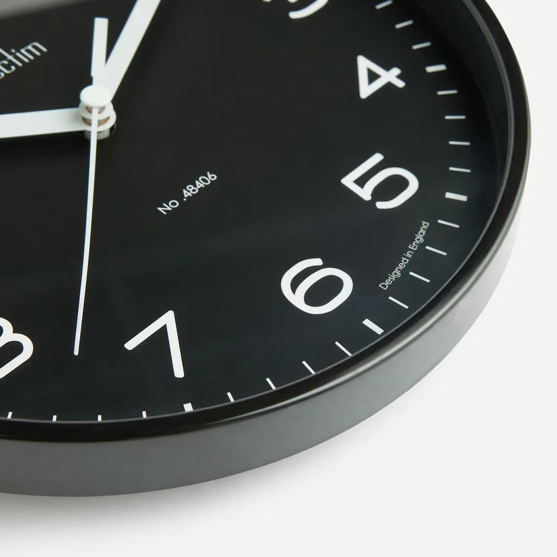Настенные часы современного дизайна, отличающиеся стеклянными линзами и кварцевым механизмом. Он включает в себя белый циферблат и черные цифры.