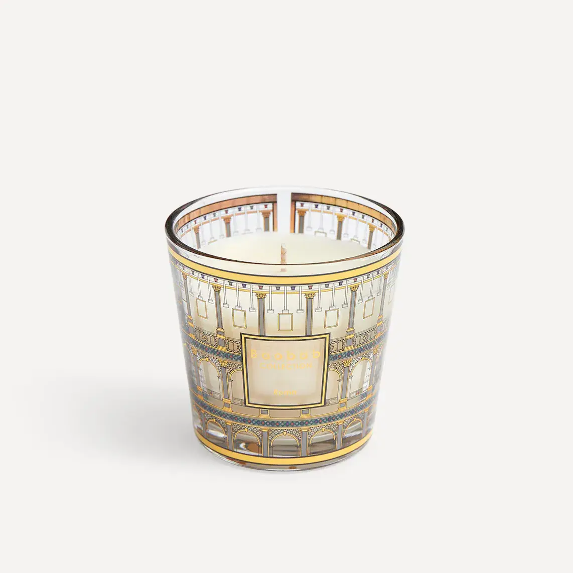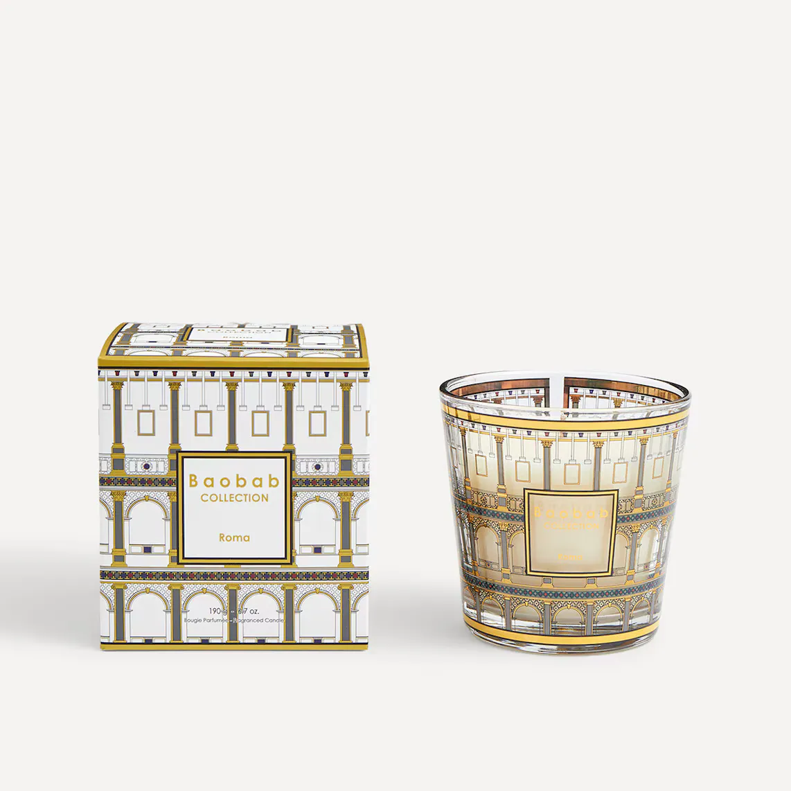 Ароматическая свеча оригинального дизайна с красочной трафаретной печатью, напоминающей римскую архитектуру, создает тщательно продуманное сочетание ароматов пачули, бобов тонка и кориандра.