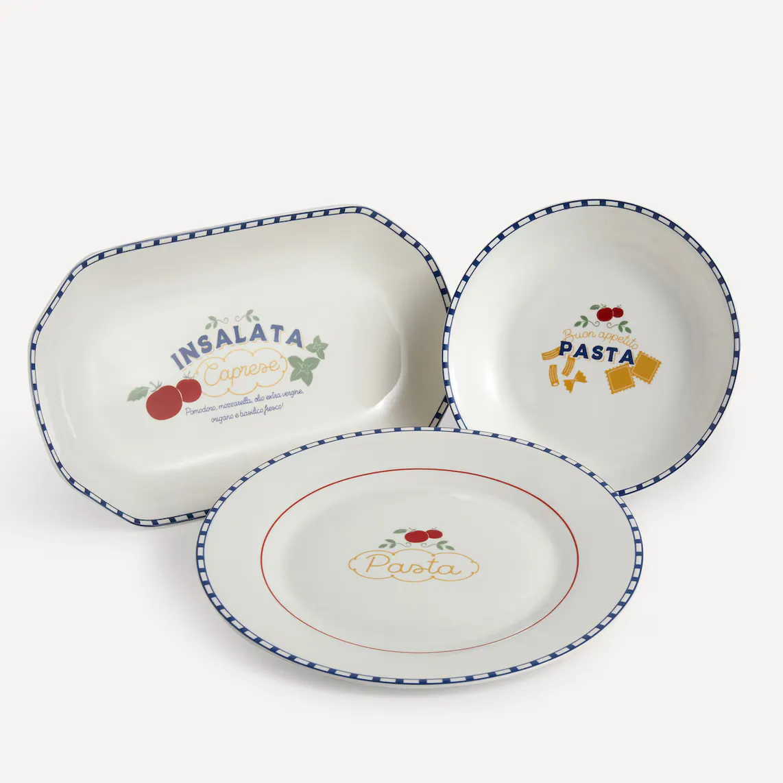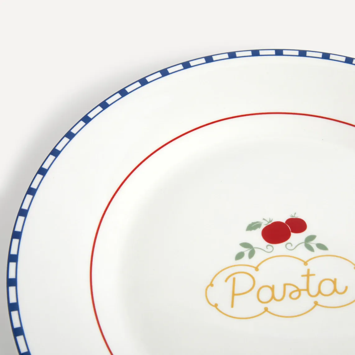 Специальная тарелка для макарон, украшенная рисунком ветки томата на белом фоне и синей окантовкой. Он изготовлен из фарфора, поэтому его можно использовать ежедневно, поскольку это твердый материал, устойчивый к термическим ударам.