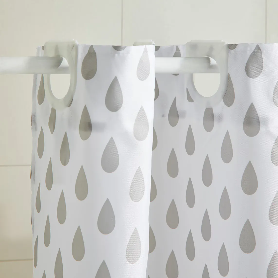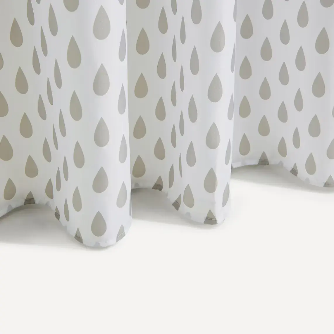 Занавеска для душа серого цвета с каплевидным рисунком, которую можно комбинировать с ковриком для ванной той же модели.