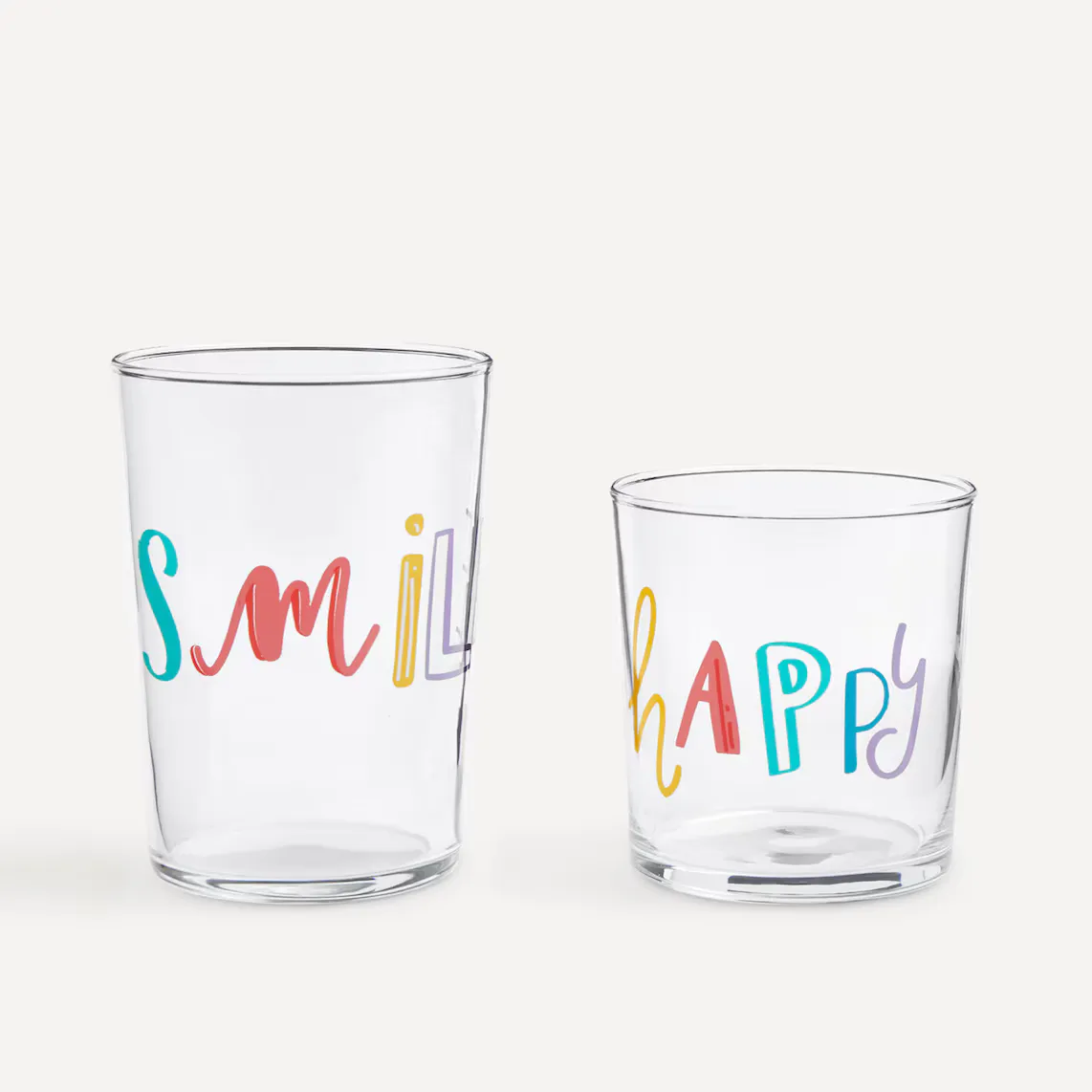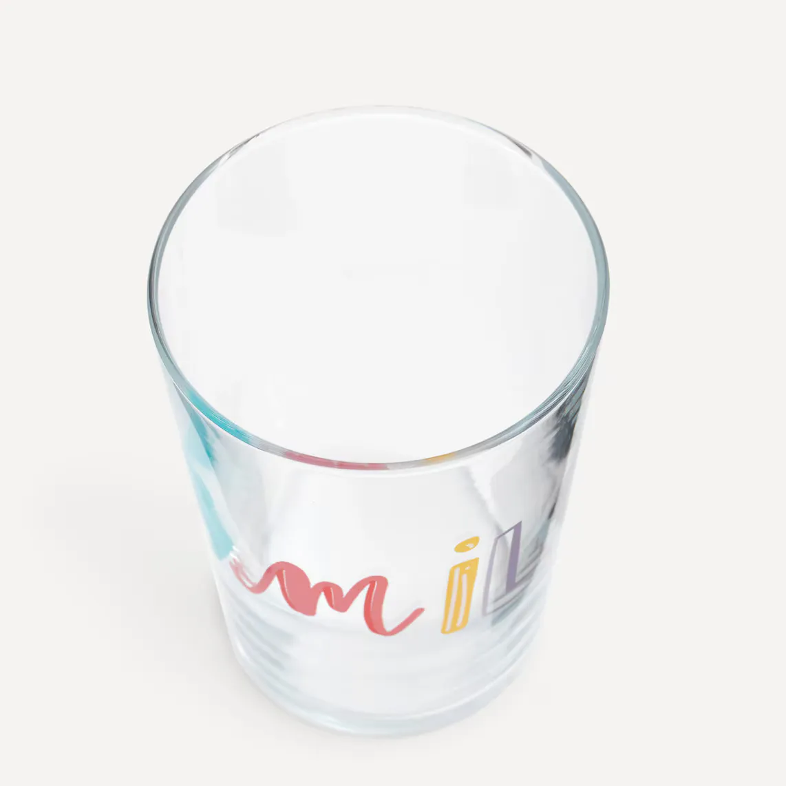 Стакан воды из стекла с веселым и веселым дизайном с надписью «Улыбнись» в цветах. Он имеет емкость 51 мл, его можно мыть в посудомоечной машине и использовать в микроволновой печи.