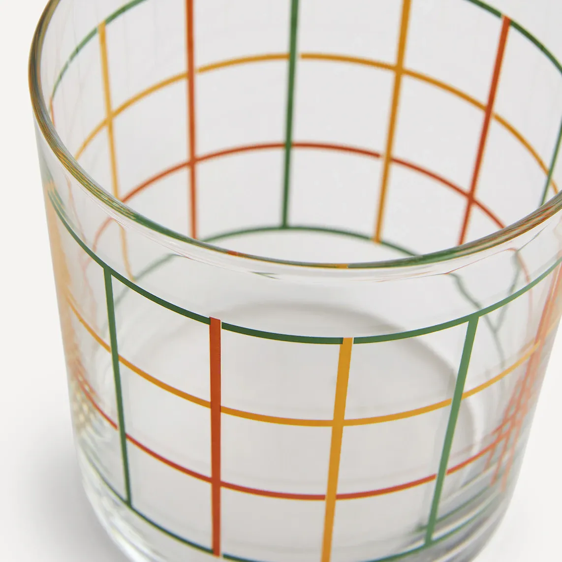 Стакан для воды емкостью 34,5 мл, изготовленный из прочного стекла. Прозрачное стекло с эффектным разноцветным клетчатым принтом.