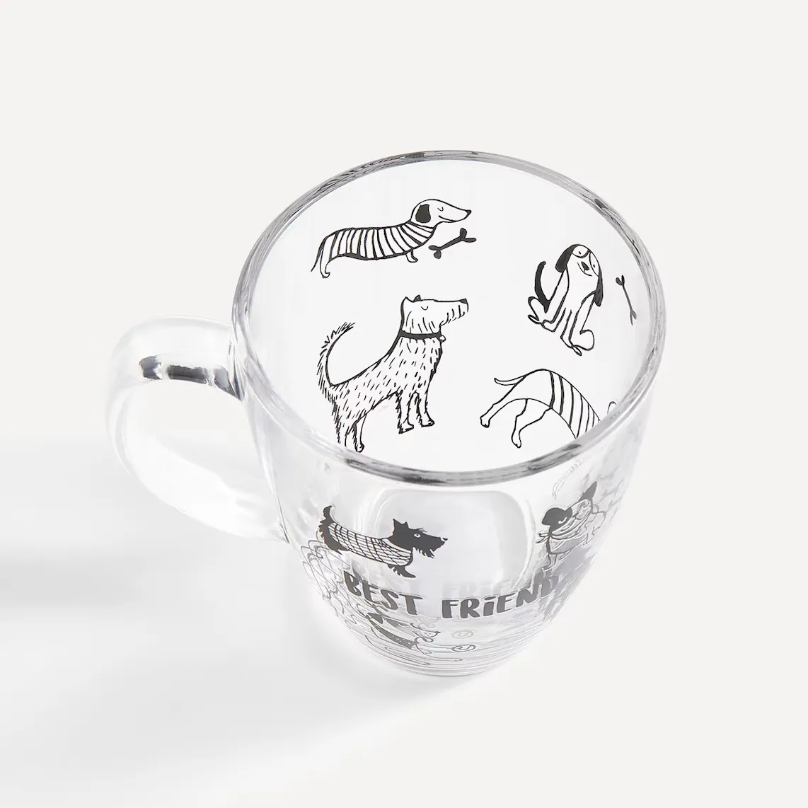 Кружка со стеклянной ручкой, идеальна для любителей собак. Он имеет емкость 370 мл и украшен черными рисунками собак в разных позах и надписью «Лучший друг». Забавный дизайн, позволяющий насладиться любимым напитком.