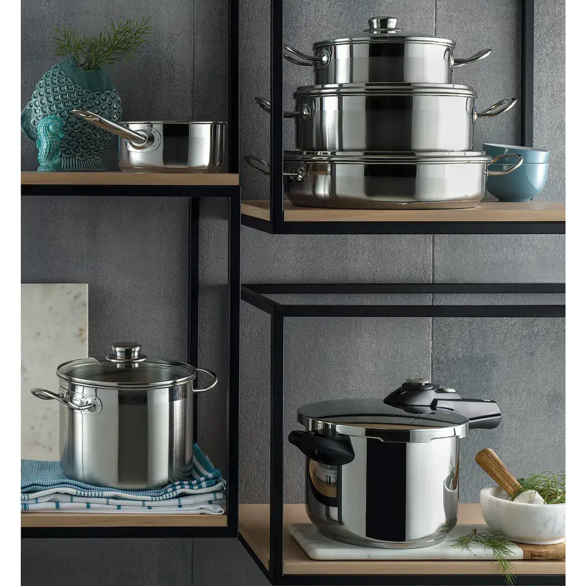 Эта кастрюля, сочетающая в себе сатинированную и полированную стальную отделку, излучает элегантность и качество.